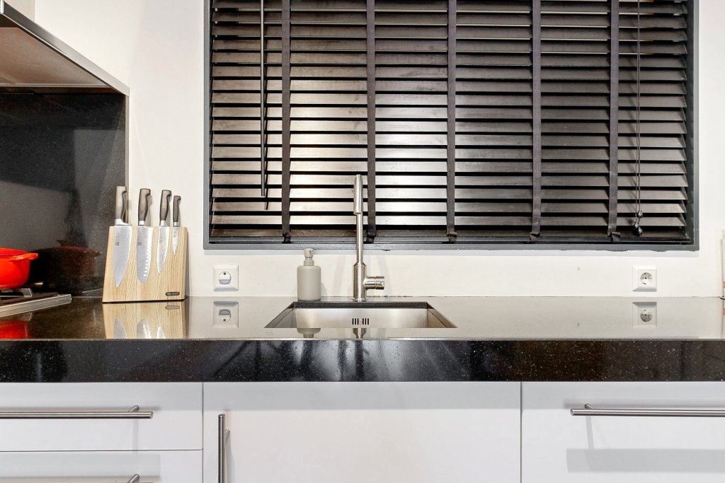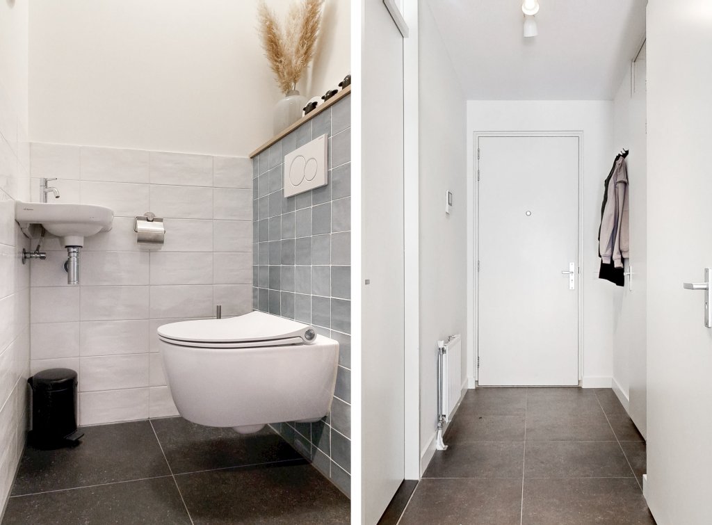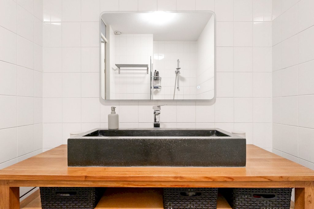 Het appartement beschikt over een ruime slaapkamer, ingericht met een kingsize box spring, grote kledingkast en een eigen TV met meubel. De badkamer is praktisch en verzorgd, voorzien van een grote wastafel en een douche. Daarnaast is er een apart toilet en een aparte wasruimte met Miele wasmachine en droger.