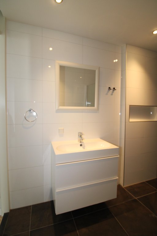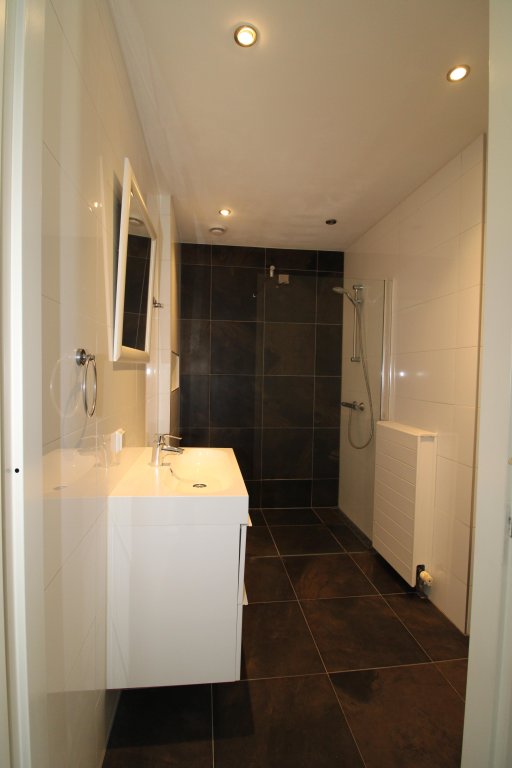 The bathroom is sleek and modern, fitted with a spacious shower, toilet, stylish washbasin unit, and mirror, creating a calm and luxurious ambiance.