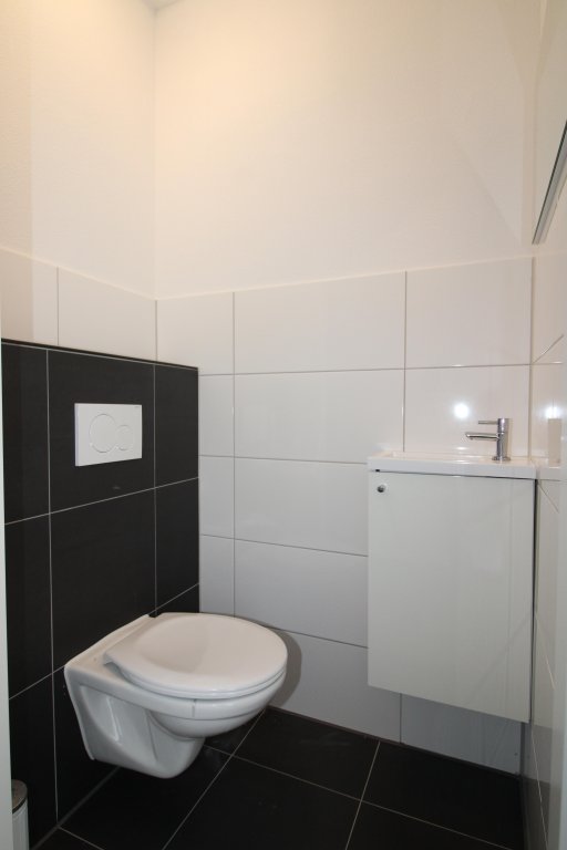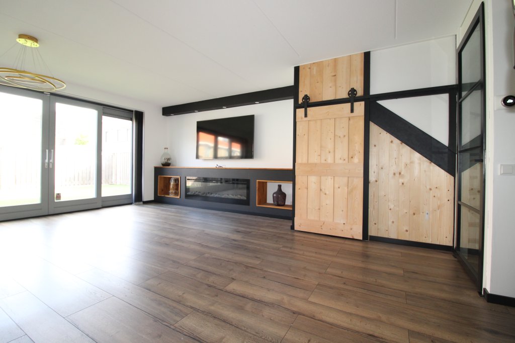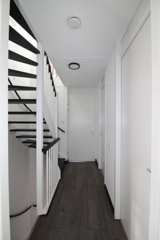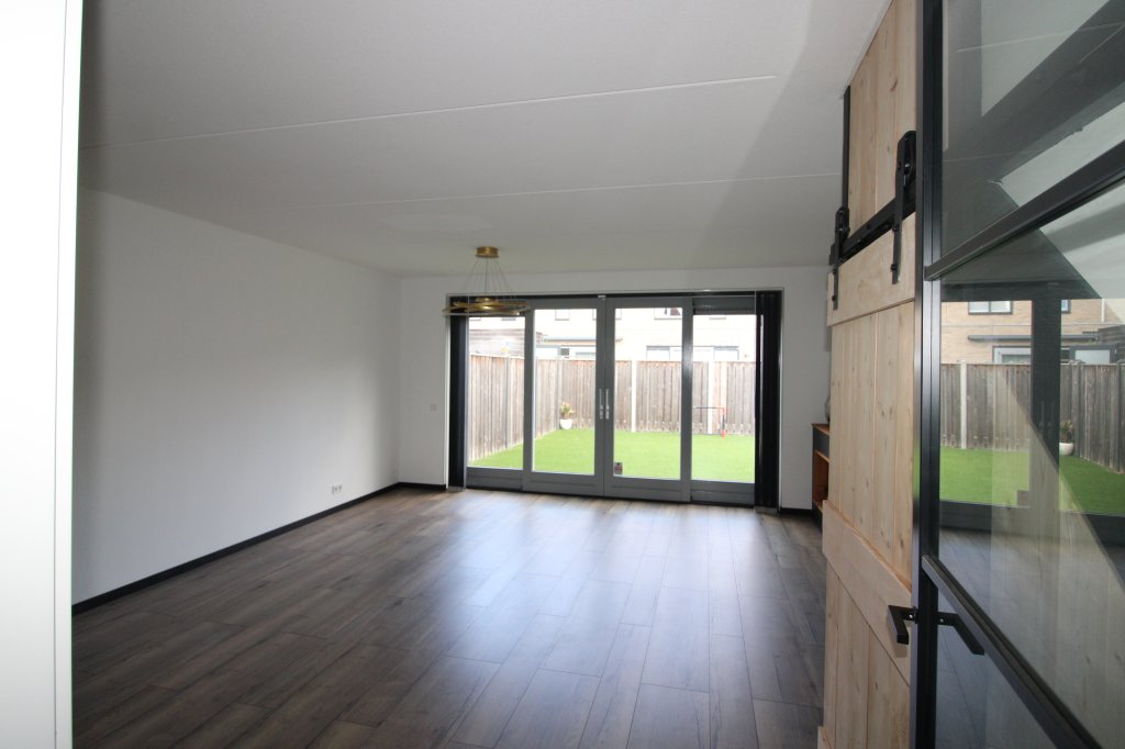 Entrance/hall with meter cupboard, fiber optic connection, toilet with hand basin, and the staircase. From the hall, you access the spacious living room with under-stairs cupboard and stable door, laminate flooring, and French doors leading to the sunny back garden. At the front of the house is the luxurious open-plan kitchen with a seating island and various built-in appliances: induction cooktop, extractor hood, dishwasher, combination microwave, fridge/freezer, and ample storage space in drawers and various cupboards. The back garden is low-maintenance and has artificial grass. The garage is accessible from both the garden and the front.