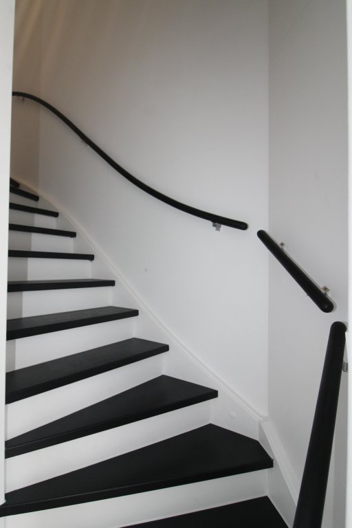 Landing with access to one bedroom at the front of the house and two bedrooms at the rear. The bedrooms vary in size, and one has an additional side window. The modern bathroom is equipped with a walk-in shower, toilet, sink, and a window for extra ventilation. This floor also has laminate flooring.