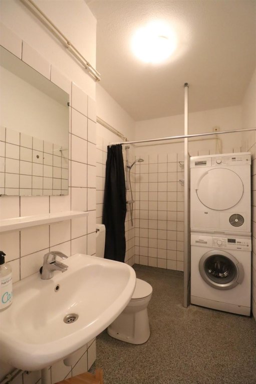 General entrance with staircase leads to the third floor and further entrance to the apartment. The apartment hallway gives access to all rooms. At the front side of the apartment is the spacious and sun-drenched living area with French balcony and open kitchen with dining area. At the rear of the apartment, the bedroom with large wardrobe offers a view over the enclosed greenery and playground of the complex. The bathroom with shower, toilet, sink, washing machine, and dryer is centrally located, as well as a convenient hall cabinet.