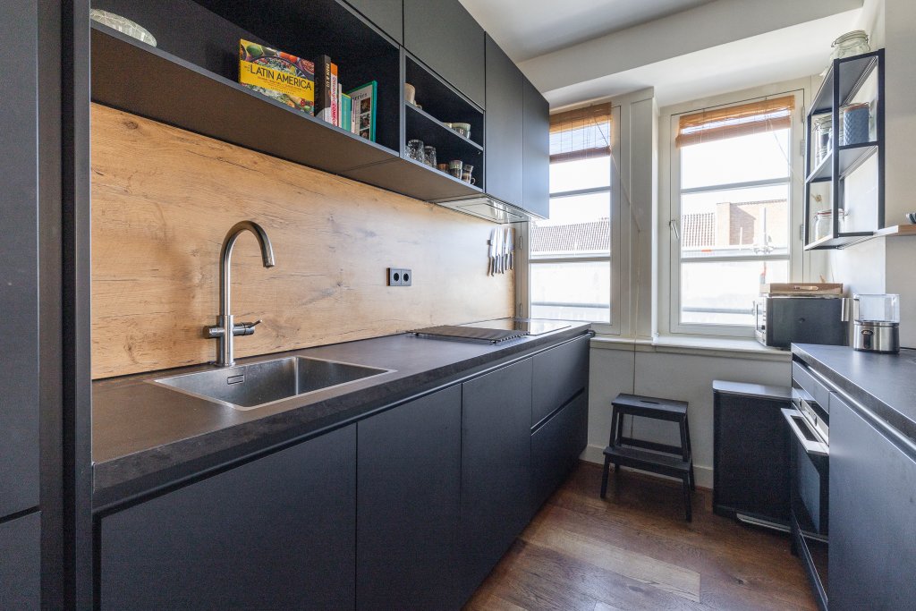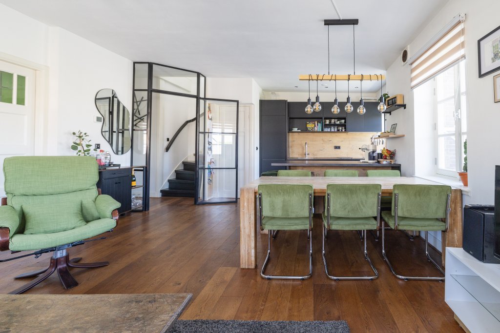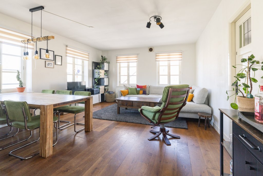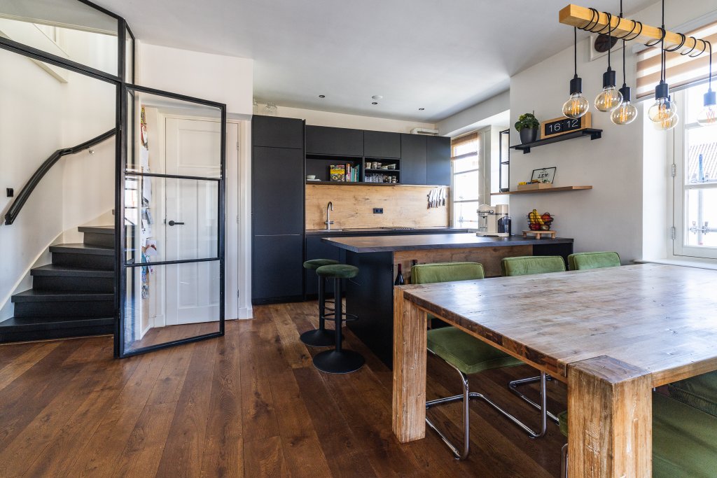 Via the shared stairwell, you reach the entrance on the third floor. Upon entering, the open and bright atmosphere immediately stands out. The spacious living room features large windows, allowing plenty of natural light to flood in. The combination of warm hardwood floors, sleek walls, and modern steel doors gives the home a contemporary and stylish look. The open kitchen flows seamlessly into the living area and features a modern design with various built-in appliances and a practical cooking island that also serves as a cozy spot for dining or socializing.