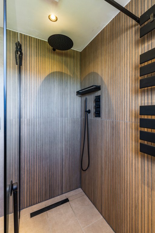 The upper floor offers two more generously sized bedrooms, all neatly finished and bathed in pleasant natural light. This floor also houses the luxurious bathroom, equipped with a walk-in shower and a stylish vanity unit. Everything has been designed with an eye for detail and comfort, contributing to the move-in-ready nature of the home.