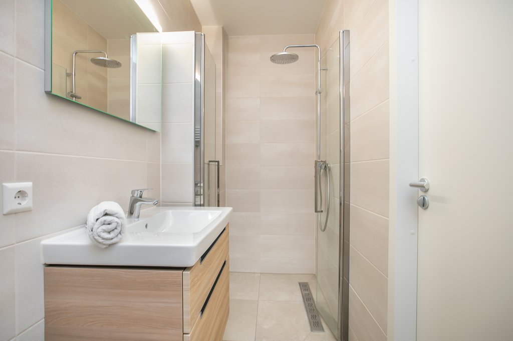The bedrooms are located at the front and are both suitable for a double bed. The bathroom has a bathtub, a very comfortable walk-in shower, washbasin cabinet with double taps, bathroom mirror with LED lighting, mechanical ventilation and underfloor heating. The whole is done in neutral colors. In the hallway is a separate toilet and an indoor storage room with plumbing for washer and dryer.