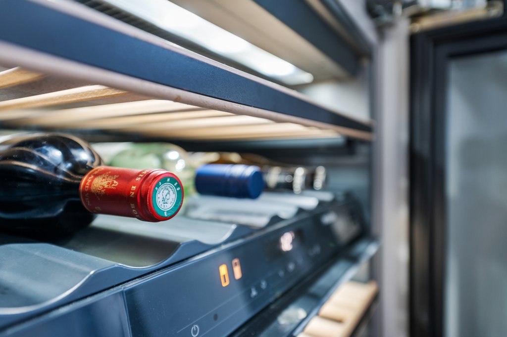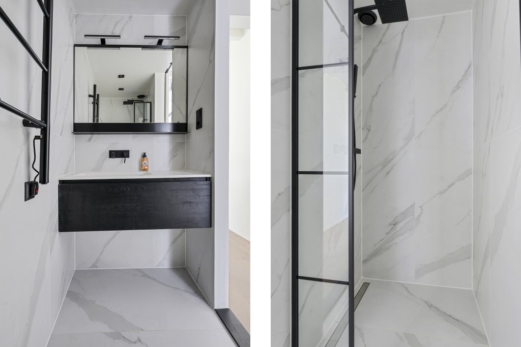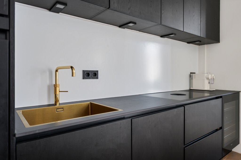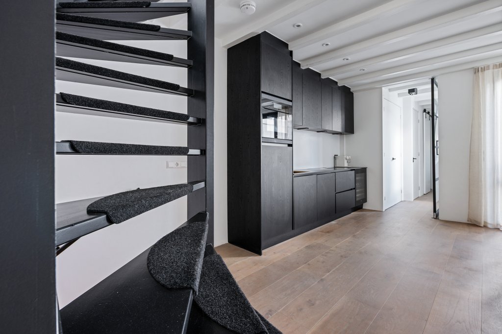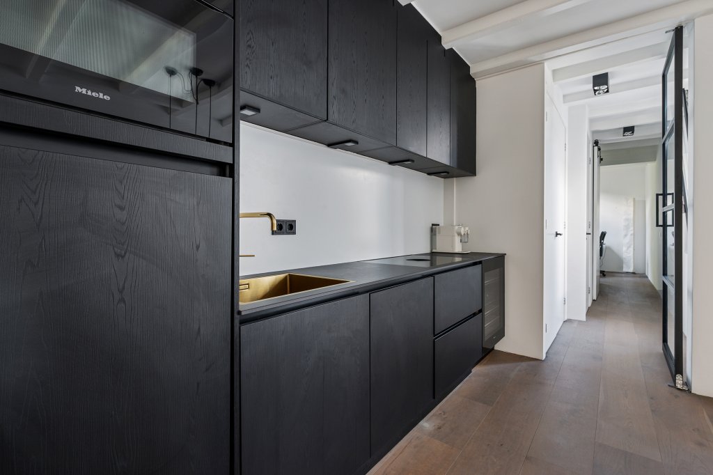 The apartment is designed in an industrial style with black steel accents and high-end finishes. A solid oak floor with underfloor heating runs throughout the entire home. The sleek matte-black kitchen is fully equipped with premium Miele built-in appliances, a Bora induction cooktop with integrated extractor, a Quooker (including sparkling water option), and a wine climate cabinet.