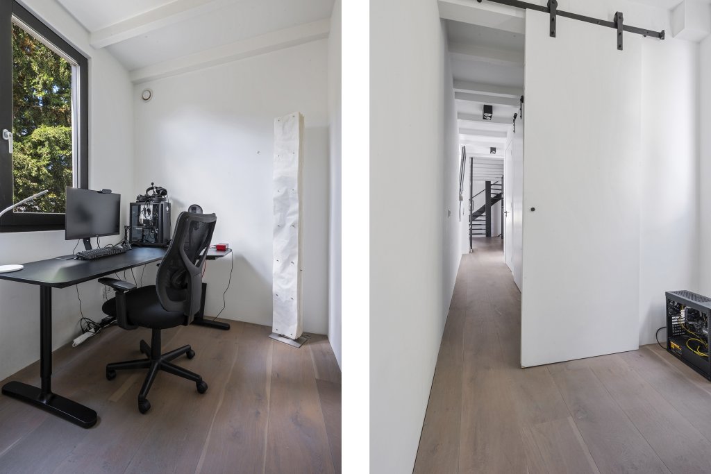 The top floor is fully dedicated to the master bedroom, with a ceiling height of approximately 2.55 meters and a large skylight with blackout shades. From this room, you step directly onto the sunny roof terrace.