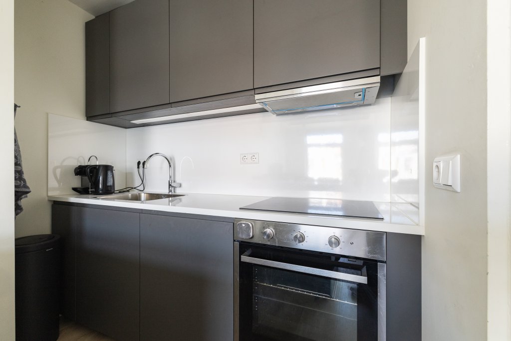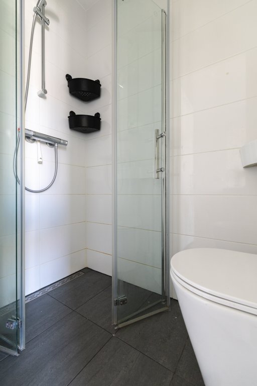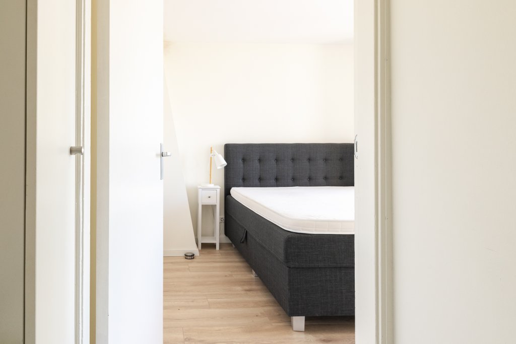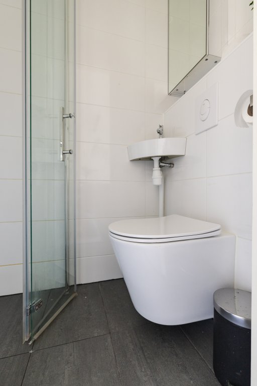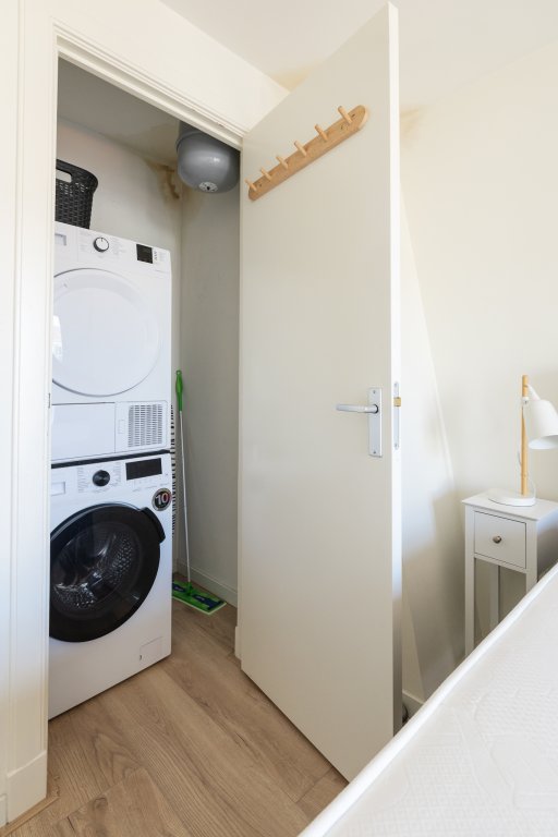 On the other side of the apartment is the quiet bedroom, perfectly suited as a sleeping and workspace. The bathroom is practically designed and features a shower and sink. There is also a separate toilet. The apartment also has a washer and dryer, which completes the living comfort.