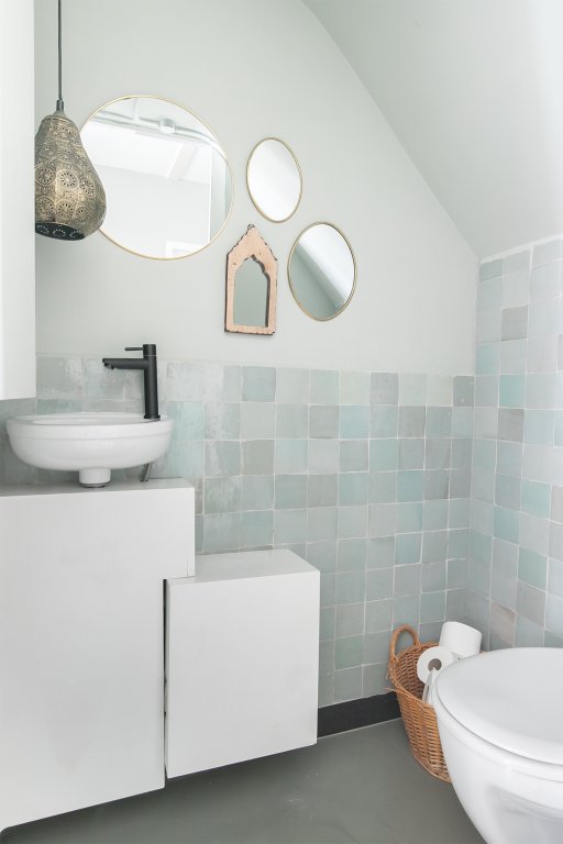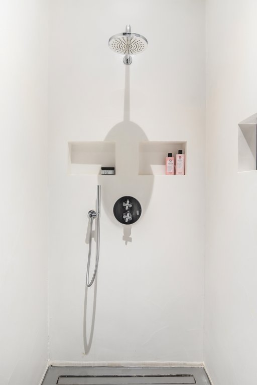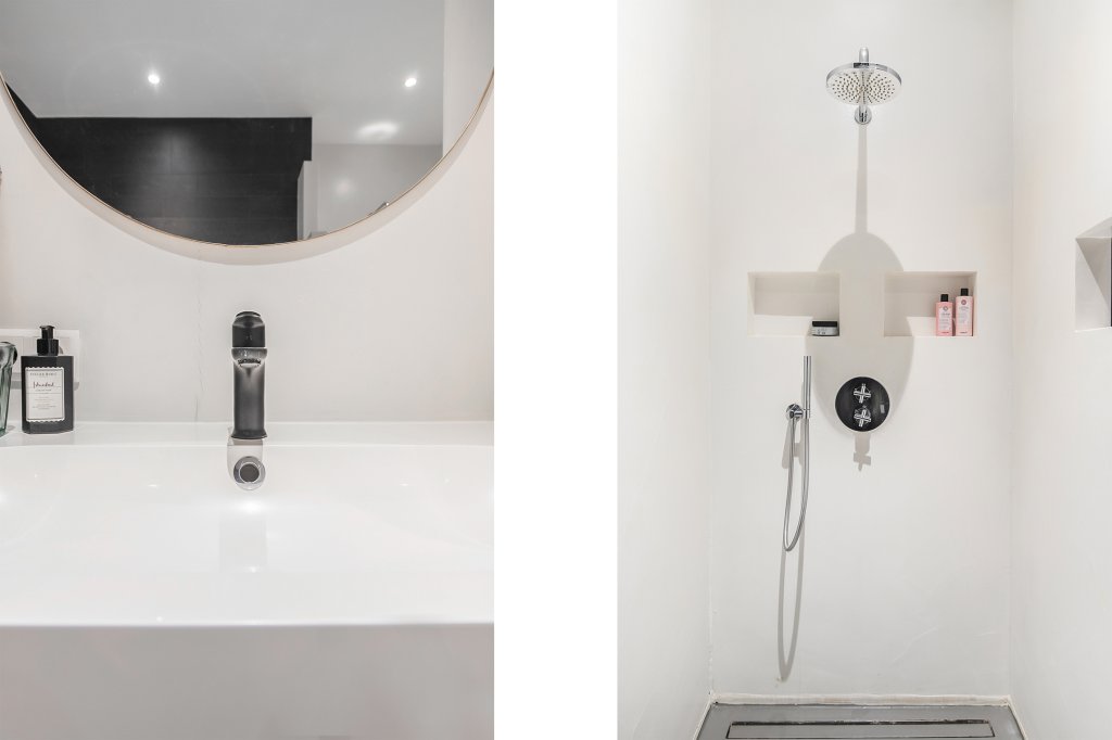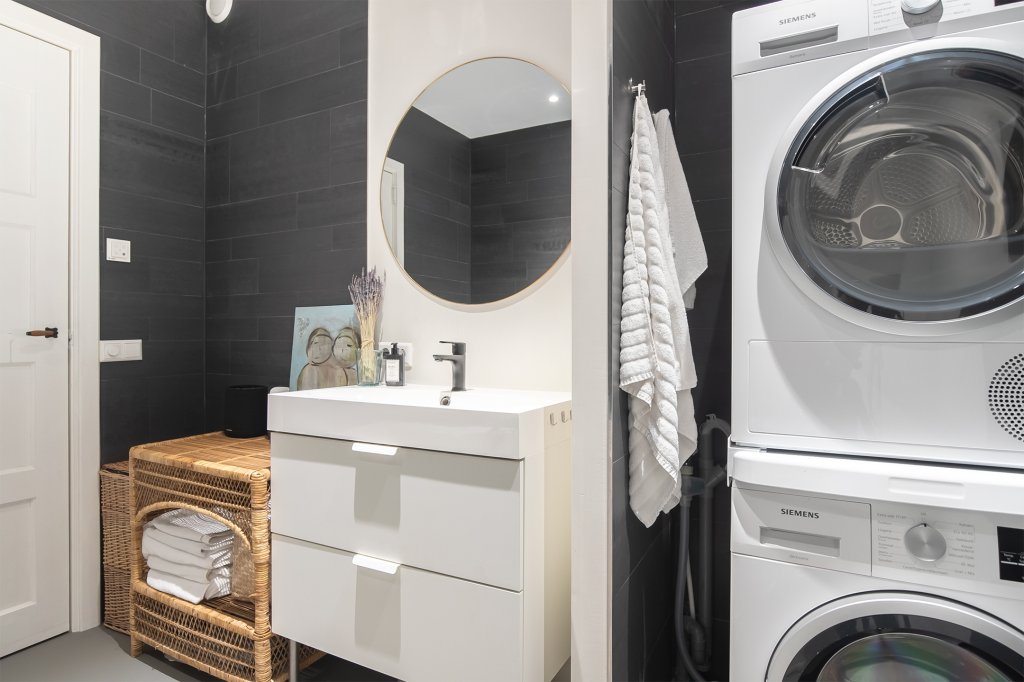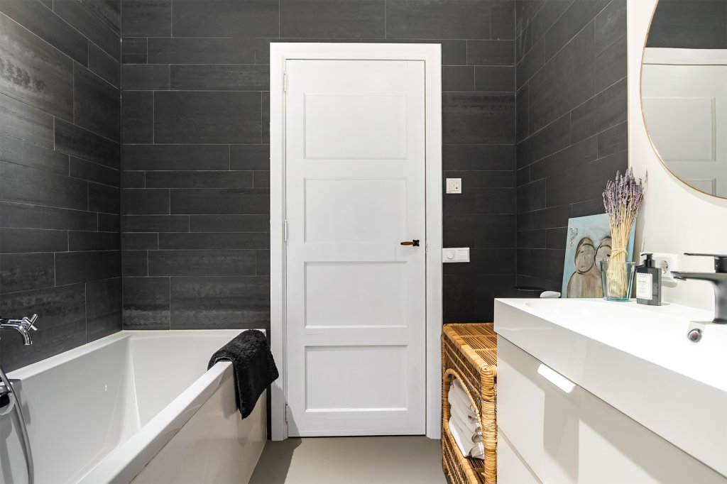 Through the hallway, you reach the neat bathroom and separate toilet. The bathroom is fully equipped with a bathtub, walk-in shower, double sink, and washing machine connection.