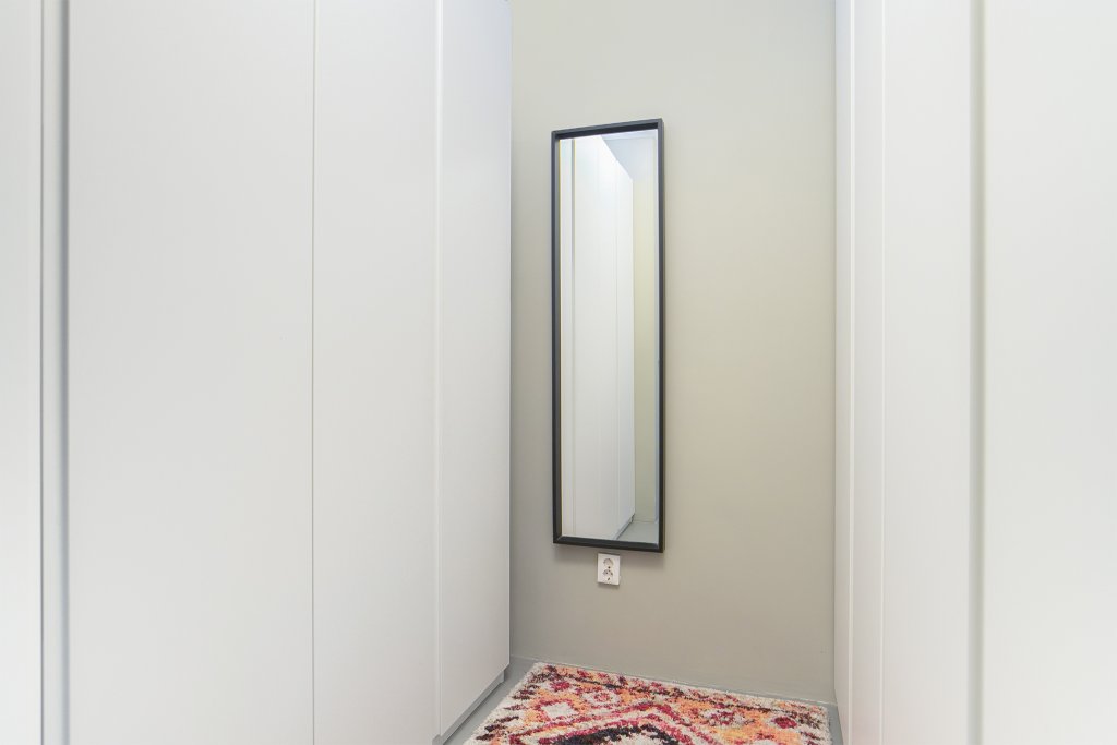 Through the private entrance, you enter the bright living room with open-plan kitchen. The beautiful flooring, which runs throughout the apartment, immediately catches your eye, creating a warm, luxurious feel. The recently renovated kitchen is modern and fully equipped with built-in appliances, a luxury American-style refrigerator, and a double sink – ideal for those who enjoy cooking and entertaining.