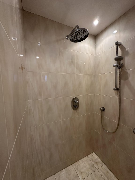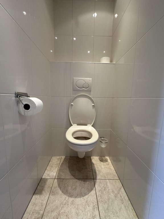 The spacious kitchen has a cozy dining area and is equipped with a refrigerator, combination oven/microwave, dishwasher, cooktop, and extractor hood. From the kitchen, you enter the utility room, which houses the washing machine connection and a second toilet. There is also a door from the utility room to the outside (the so-called "back entrance").
