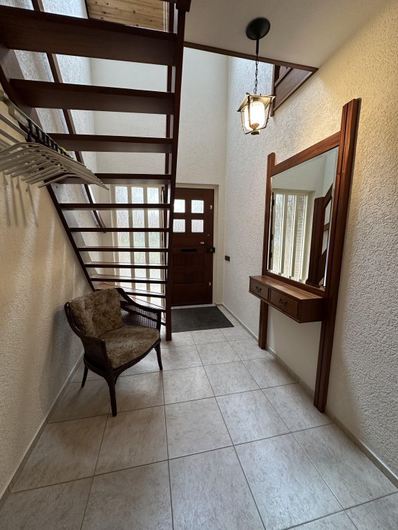 The spacious kitchen has a cozy dining area and is equipped with a refrigerator, combination oven/microwave, dishwasher, cooktop, and extractor hood. From the kitchen, you enter the utility room, which houses the washing machine connection and a second toilet. There is also a door from the utility room to the outside (the so-called "back entrance").