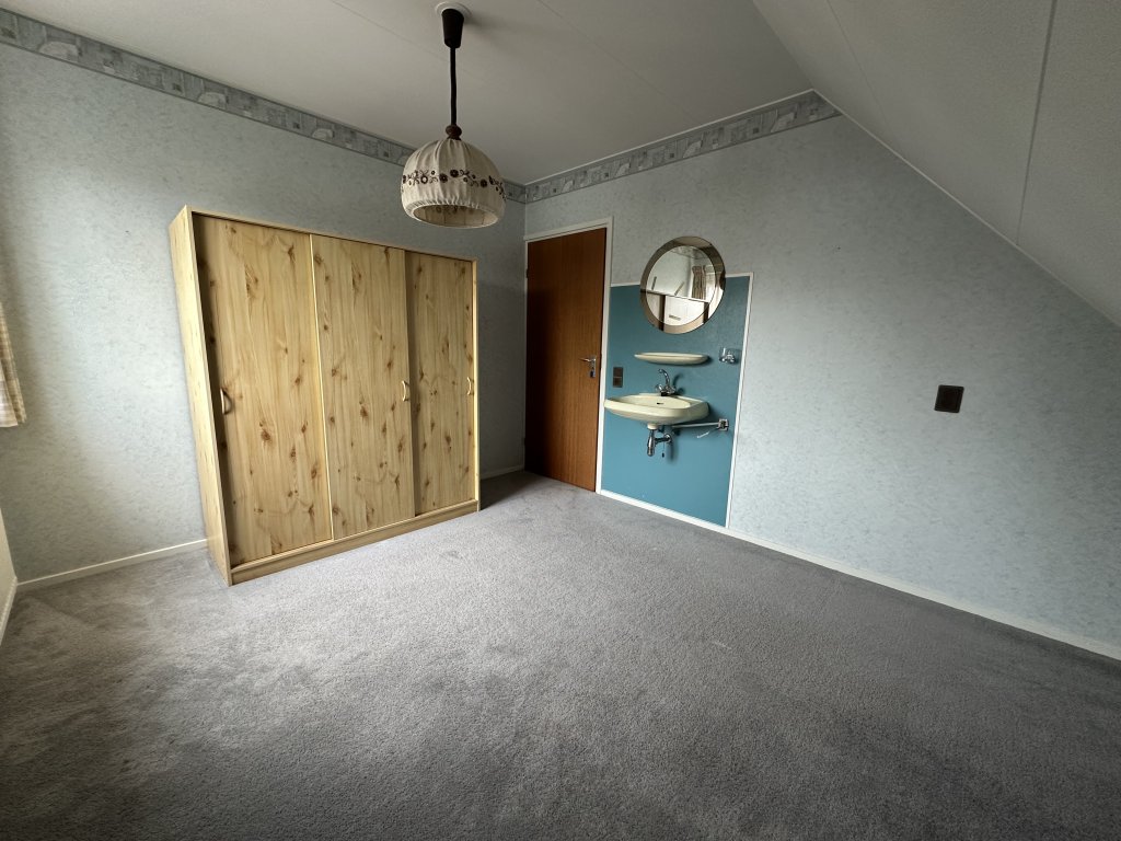 Entrance/hall with meter cupboard. Spacious living room with a cozy wood-burning fireplace and large sliding doors leading to the garden. From the living room, you reach a bedroom with an adjoining bathroom, equipped with a toilet and shower.