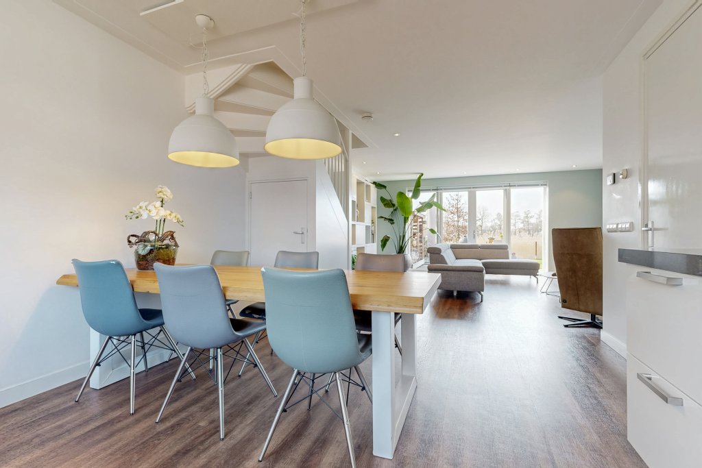Bij binnenkomst valt de heerlijk ruime en lichte woonkamer direct op. De woonkamer is voorzien van een gezellige open haard en grote schuifdeuren naar de tuin, waardoor er een naadloze overgang tussen binnen en buiten ontstaat. Dankzij de grote ramen valt er veel natuurlijk licht in de kamer.