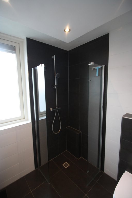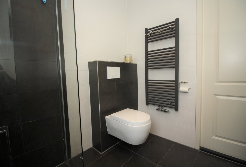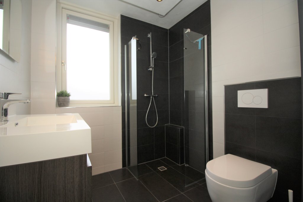 The bathroom has a modern look and has a walk-in shower with thermostatic shower tap, washbasin with sink and mixer tap, toilet and design radiator.