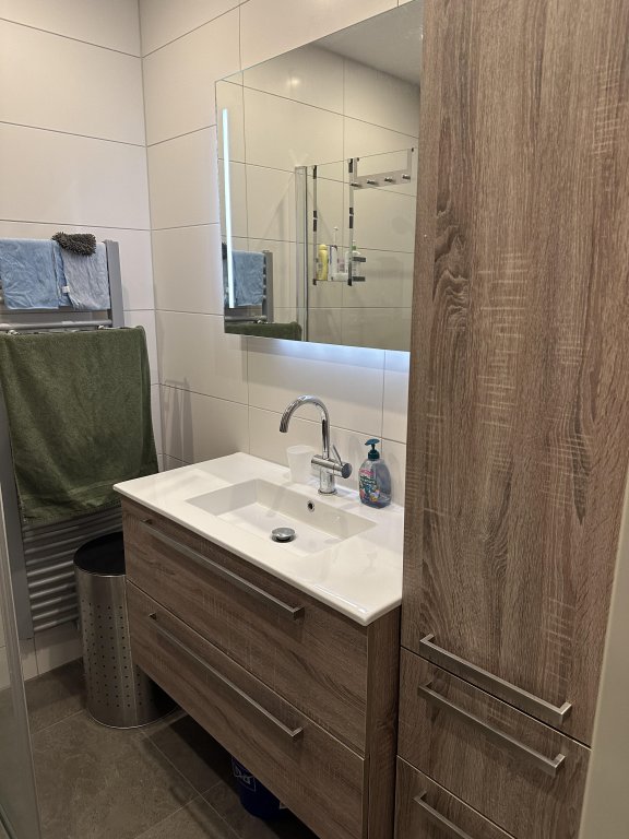 Spacious hall/entrance hall with videophone system and meter cupboard. This hall provides access to the toilet, bedroom and living room. The modern toilet is beautifully tiled in light colours and equipped with a wall-mounted toilet and washbasin; the spacious living room has sleek walls and sliding doors to the sunny balcony. The living room provides access to the technical room/storage room with space for the central heating combi boiler and heat recovery unit. The living room is open to the kitchen, which has a modern colour scheme and built-in appliances, including a dishwasher, refrigerator, freezer, combi-oven and hob. The bedroom provides access to the modern bathroom with a shower, washbasin and washing machine and dryer.