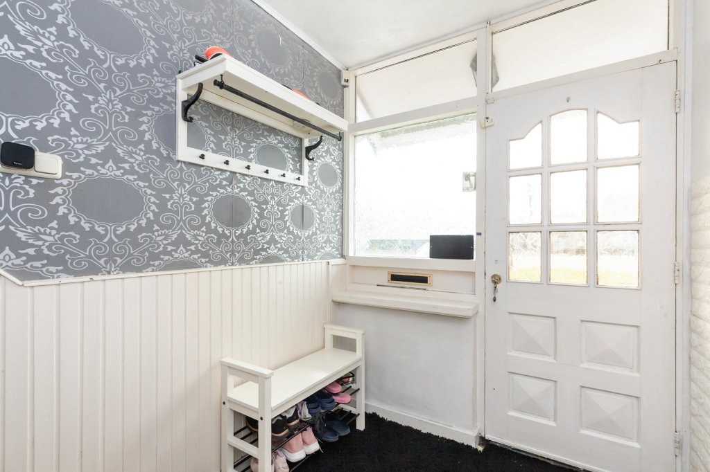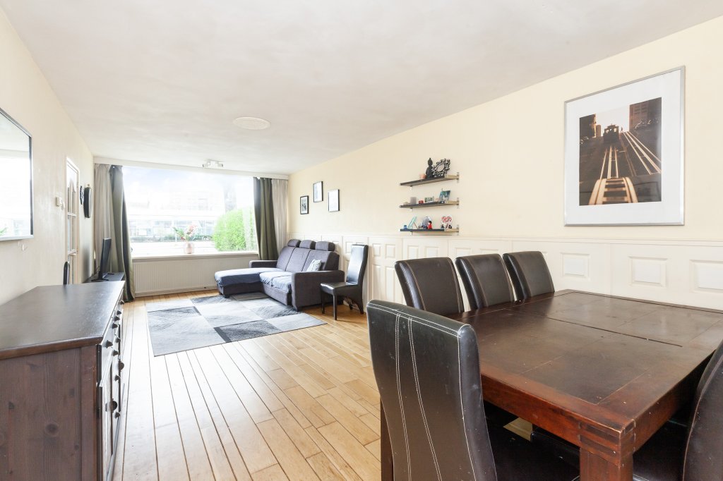 You enter the property via the hall. Here you will find the meter cupboard, a practical stair cupboard, the toilet and the fixed staircase to the first floor. From the hall, you walk through to the living room. The spacious living room is bright thanks to the large windows at the front and rear.