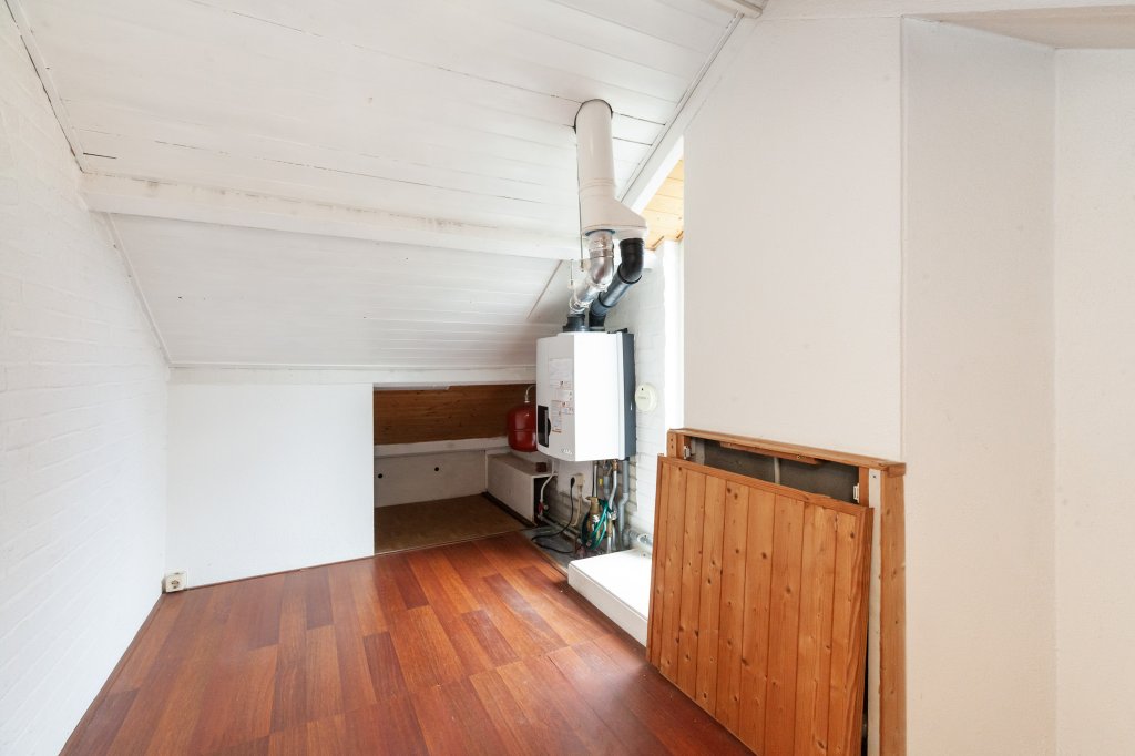 A fixed staircase leads to the attic. The lower attic houses the central heating boiler, the ventilation unit and the connections for washing appliances. The attic room is a fully-fledged extra room and is pleasantly lit thanks to the dormer window at the rear. There is also practical storage space behind the knee walls.