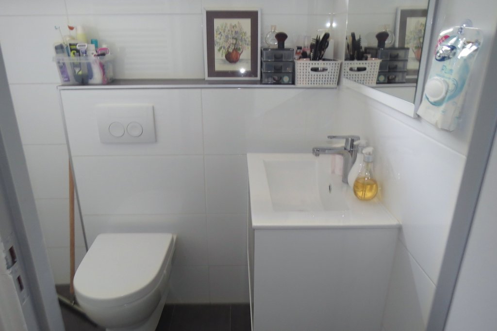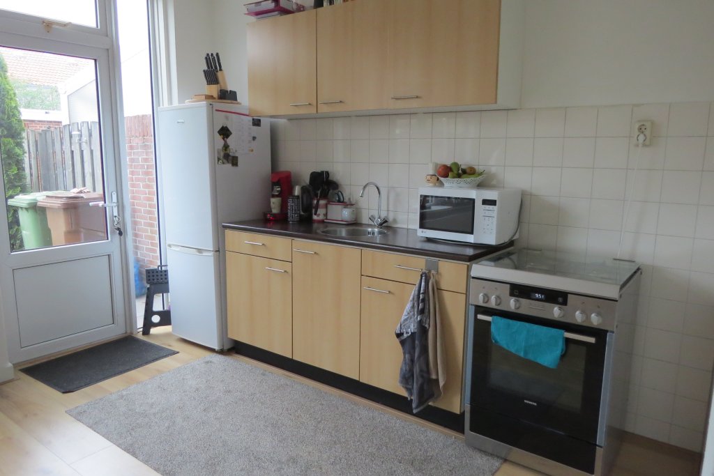 Entrance hallway gives access to the staircase to the first floor, meter cupboard, the walk-in closet, the toilet room and the spacious living room. The fully renovated and tiled toilet room has a toilet and a fountain. The spacious living room (approx. 7.20 x 3.70 m) has a nice laminate floor. The open kitchen (approx. 2.50 x 2.00 m) located at the back of the house, is simple but has a 5 burner gas hob, oven, microwave and through the kitchen there is access to the backyard via the kitchen.