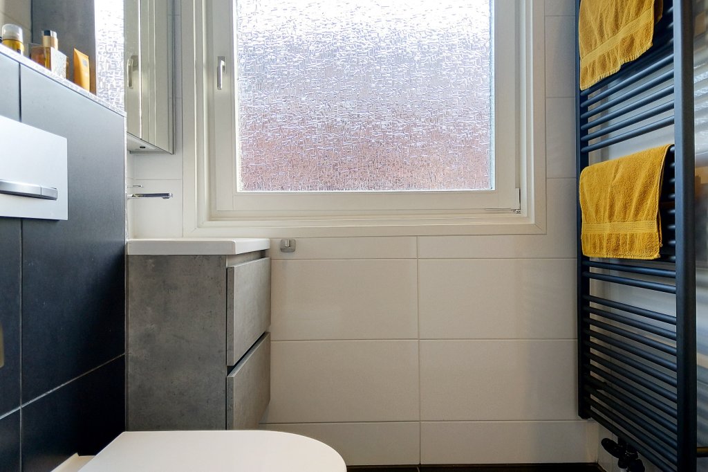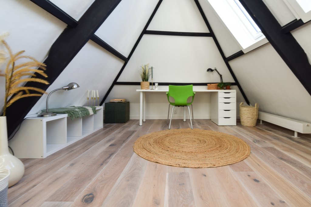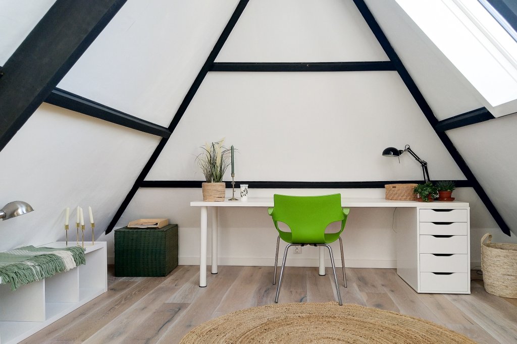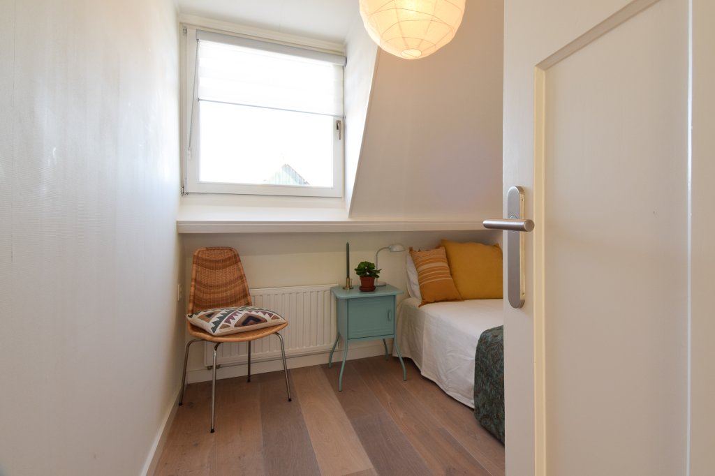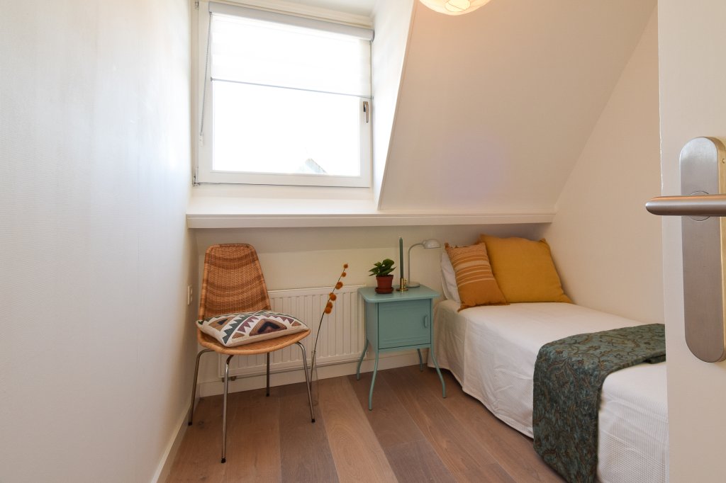 On the first floor there are three bedrooms and a modern bathroom, all tastefully decorated. The bathroom has a spacious walk-in shower, sink and toilet. In the attic there is a 4th large bedroom, now furnished as a home office.