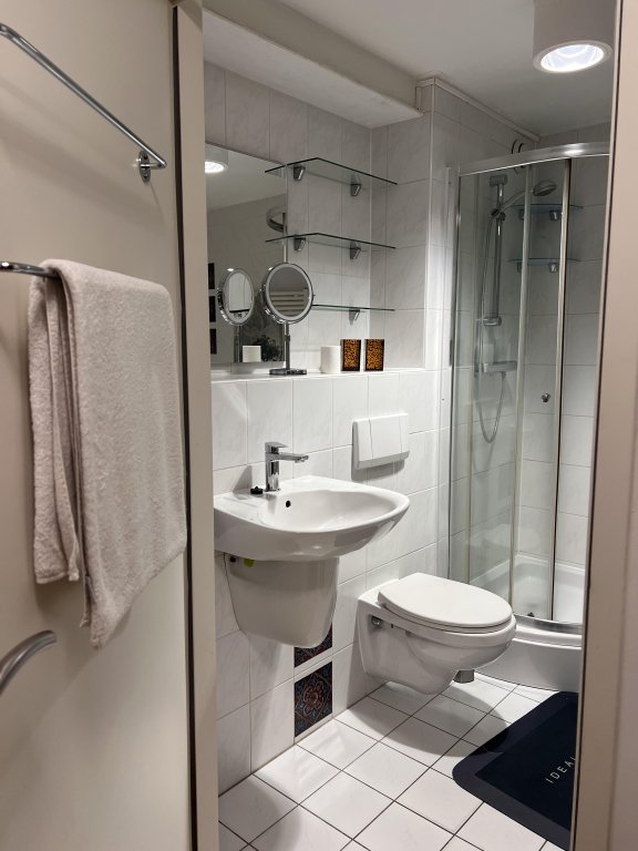 Landing. This floor features three bedrooms. A bathroom with a sink, shower, bathtub, and a second toilet is located between the bedrooms. The spacious bedroom at the front has a double bed, and at the rear of the house are two bedrooms: one is furnished as a study (with a desk and chair) and the other is furnished as a relaxation room/bedroom with a large armchair. You can, of course, also add a bed yourself.
