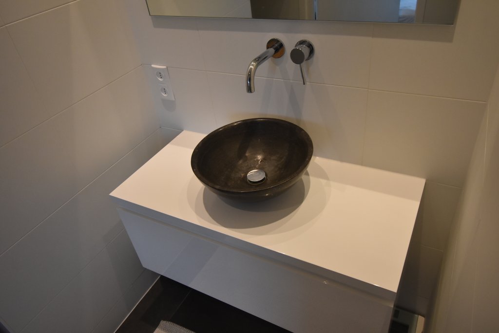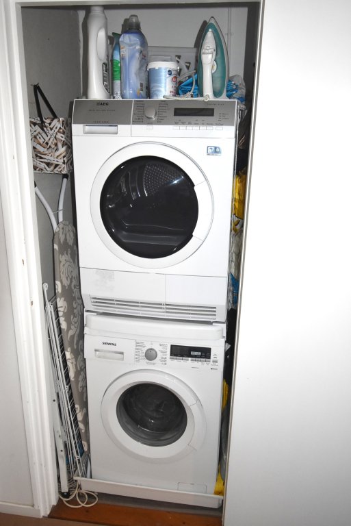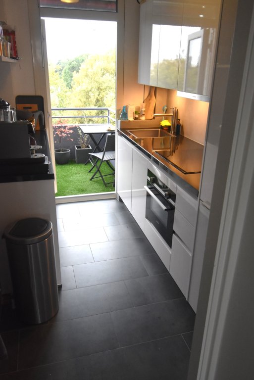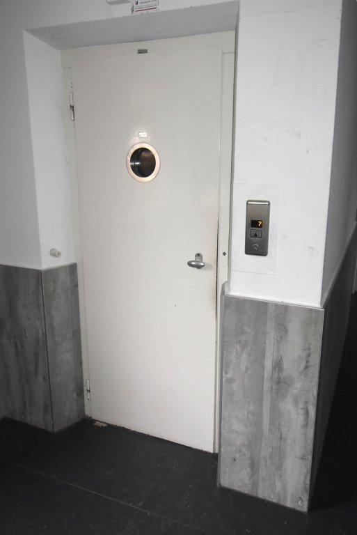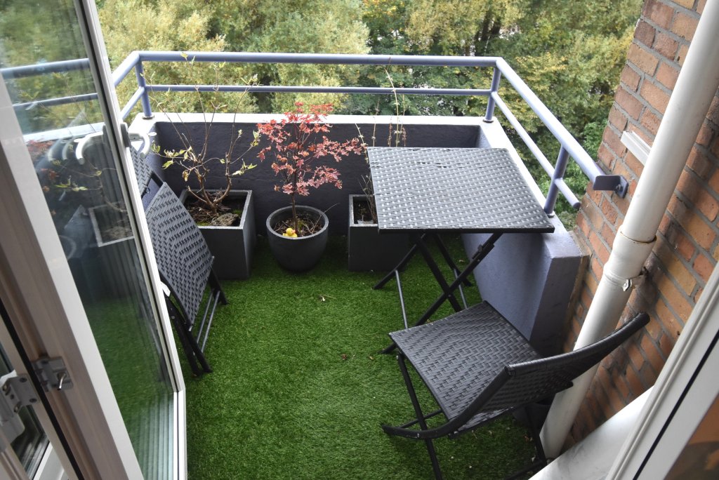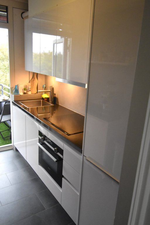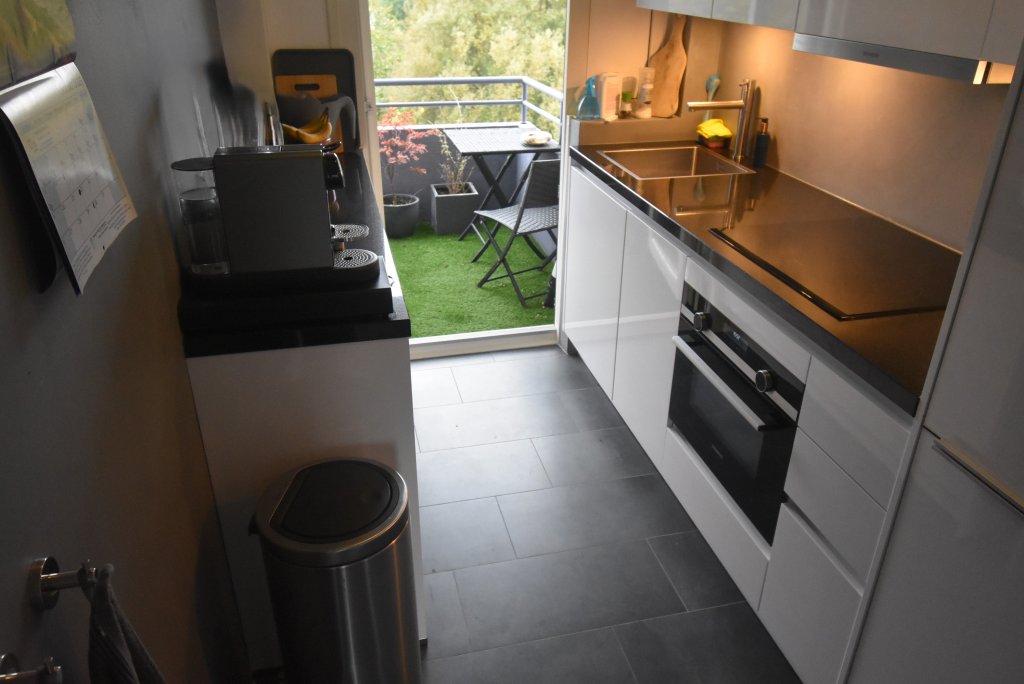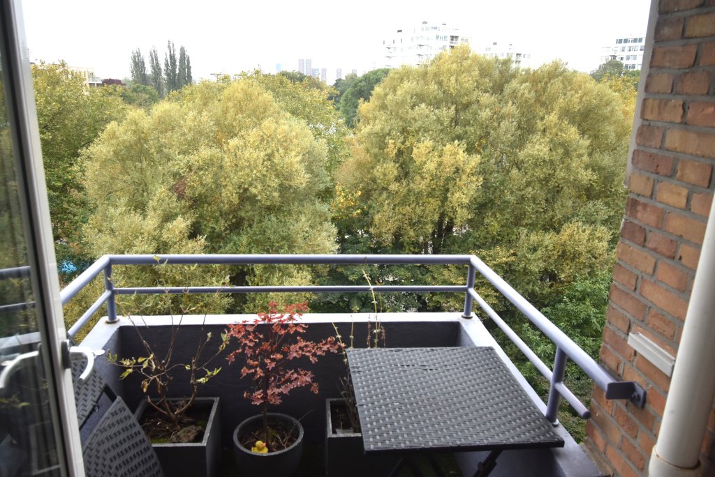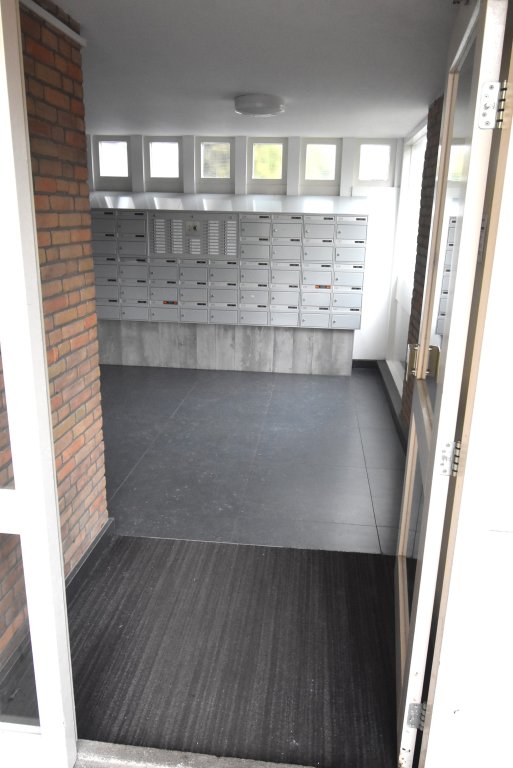 Enclosed entrance with doorbells and mailboxes. Access to the hall with staircase and elevator to the 6th floor. Apartment entrance. Hall with meter cupboard, built-in closet with washing machine and dryer. There is a modern toilet. Bright living room at the rear with a view of the greenery. The bedroom is located at the front and provides access to the modern bathroom, which has a vanity and shower. There is a modern kitchen equipped with a fridge/freezer, combination oven/microwave, induction cooktop, dishwasher, and extractor hood. From the kitchen, you have access to the southwest-facing balcony at the rear. You can park on-site (barrier); the storage unit on the ground floor is not included in the rental price.