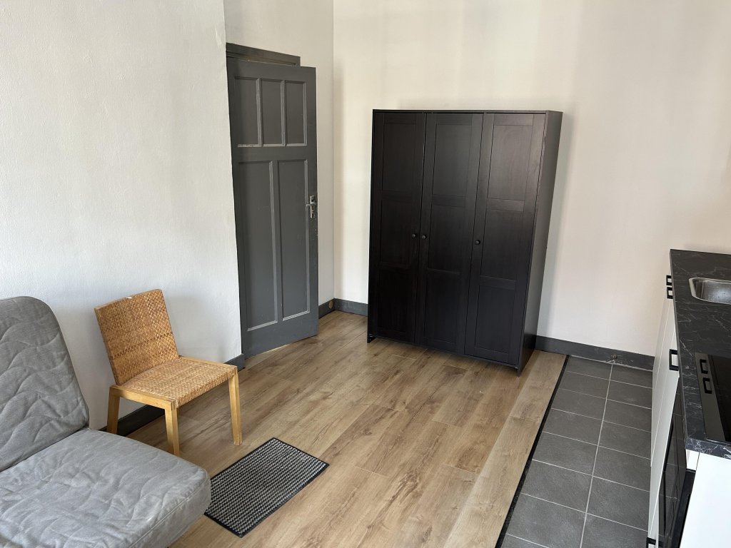 - The room is delivered furnished, with a few pieces of furniture, a shelving unit, a sofa, and a wardrobe.