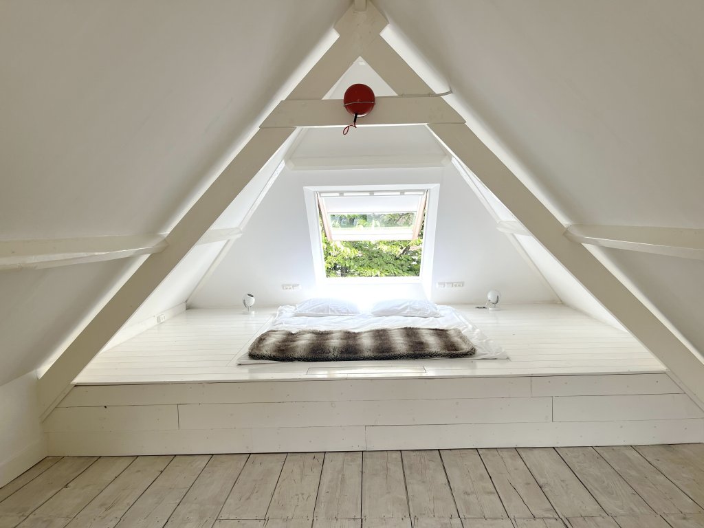 The spacious attic floor has a double bed and a built-in wardrobe. There is also a luxurious armchair.