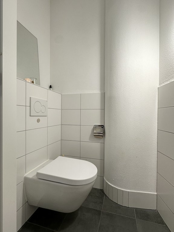 Entrance hall with toilet and storage room including washing machine connection. Spacious living room with large windows providing plenty of natural light. Dining area and open kitchen equipped with an induction hob with extractor, dishwasher, fridge-freezer combination, and combi-oven. Separate, spacious bedroom. Second room suitable as an office or guest room. Large bathroom with shower and washbasin.