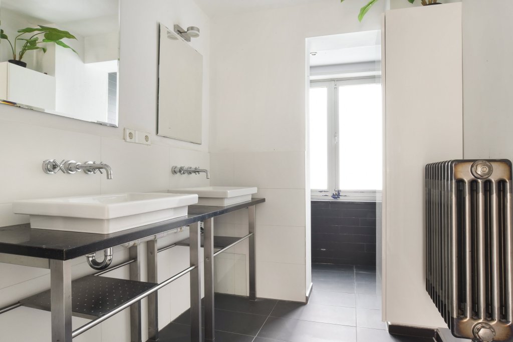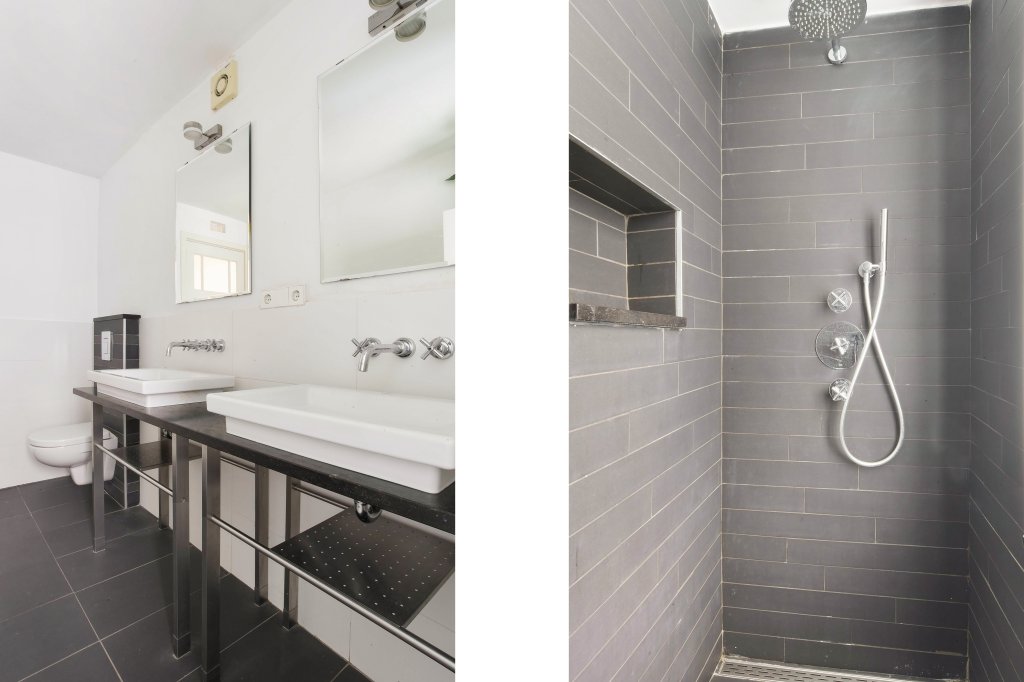The bathroom has a modern and well-maintained appearance and is fully tiled. It is equipped with a spacious walk-in shower, a double washbasin and a second toilet.