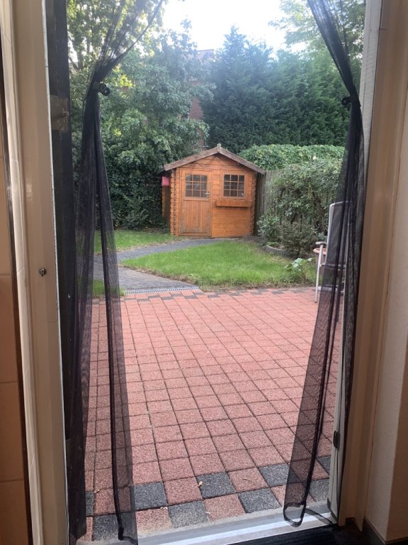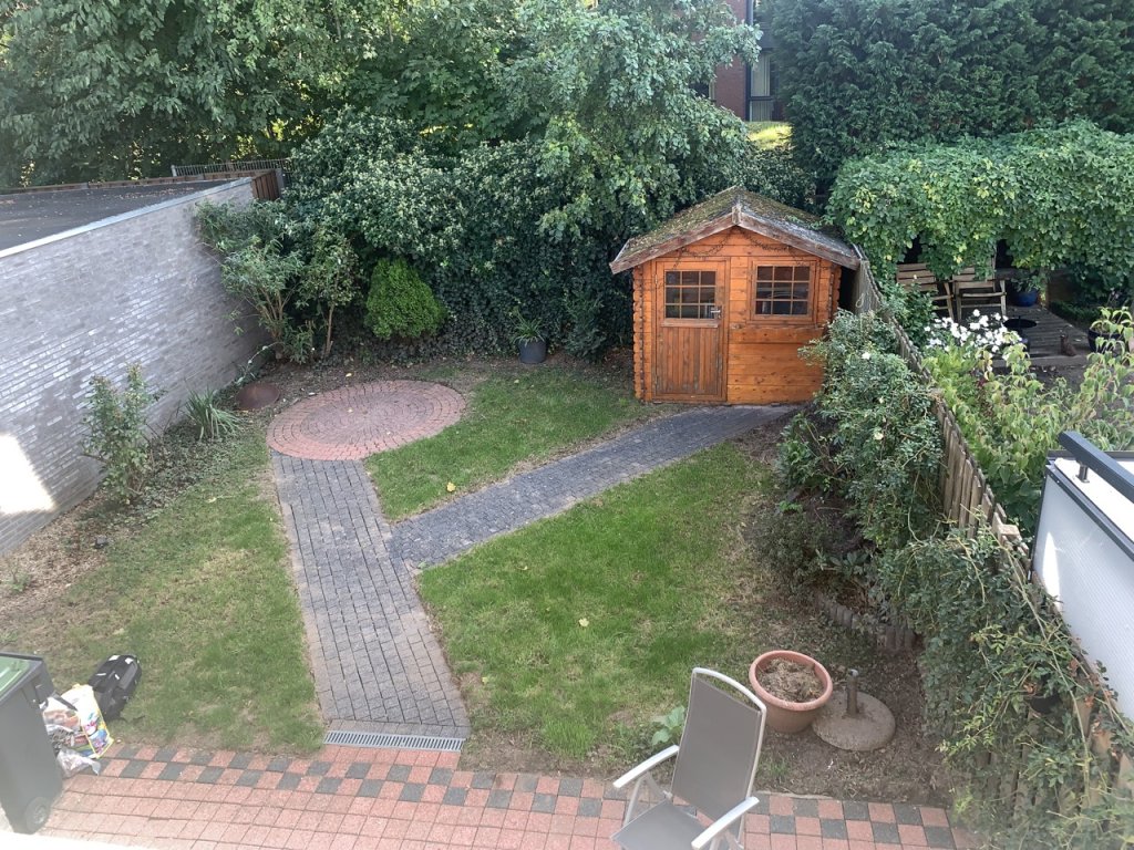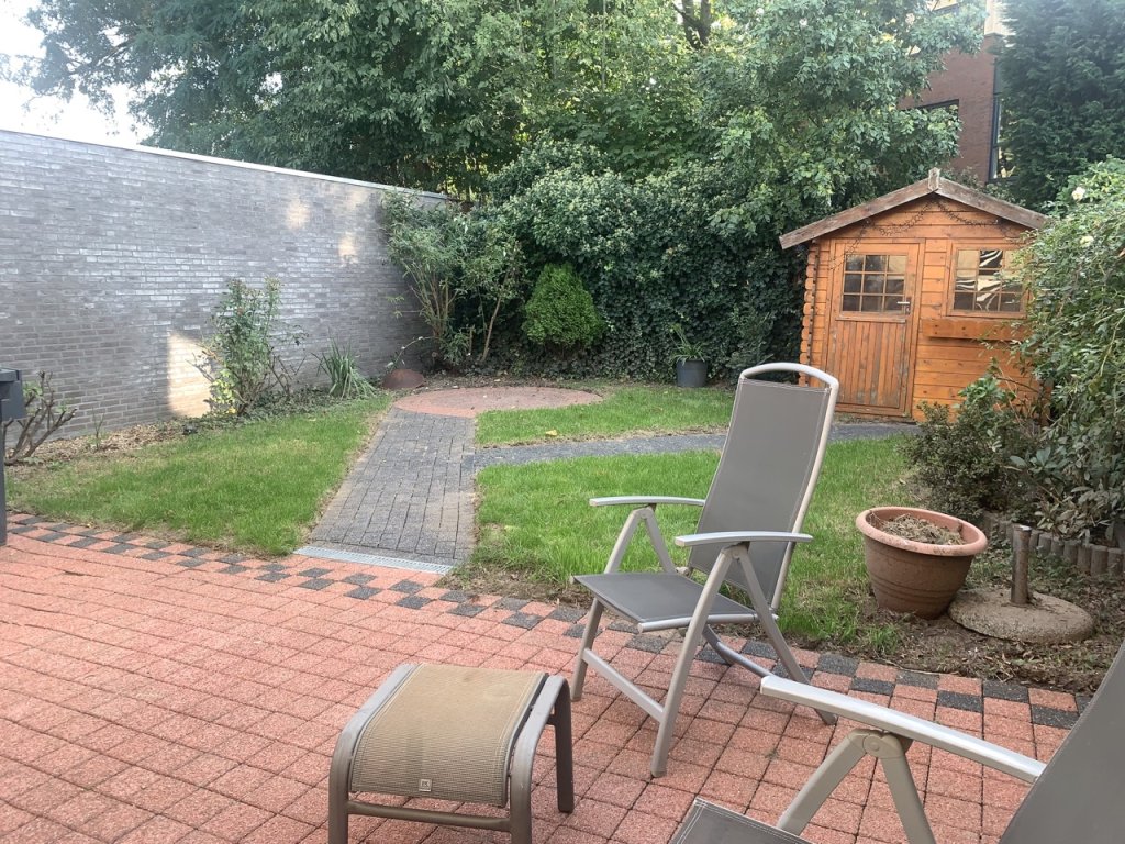 The property offers a private, enclosed garden with terrace and lawn. An idyllic garden house adds both extra storage and a charming atmosphere. Terrace furniture and a lawnmower are included. The front garden features small trees and plants, creating a tranquil setting.