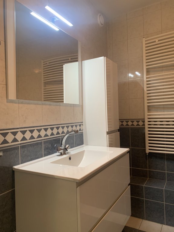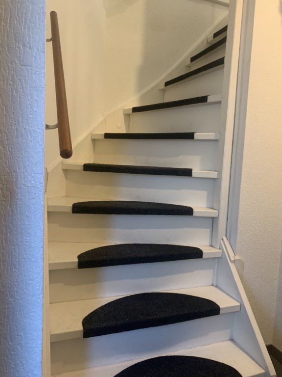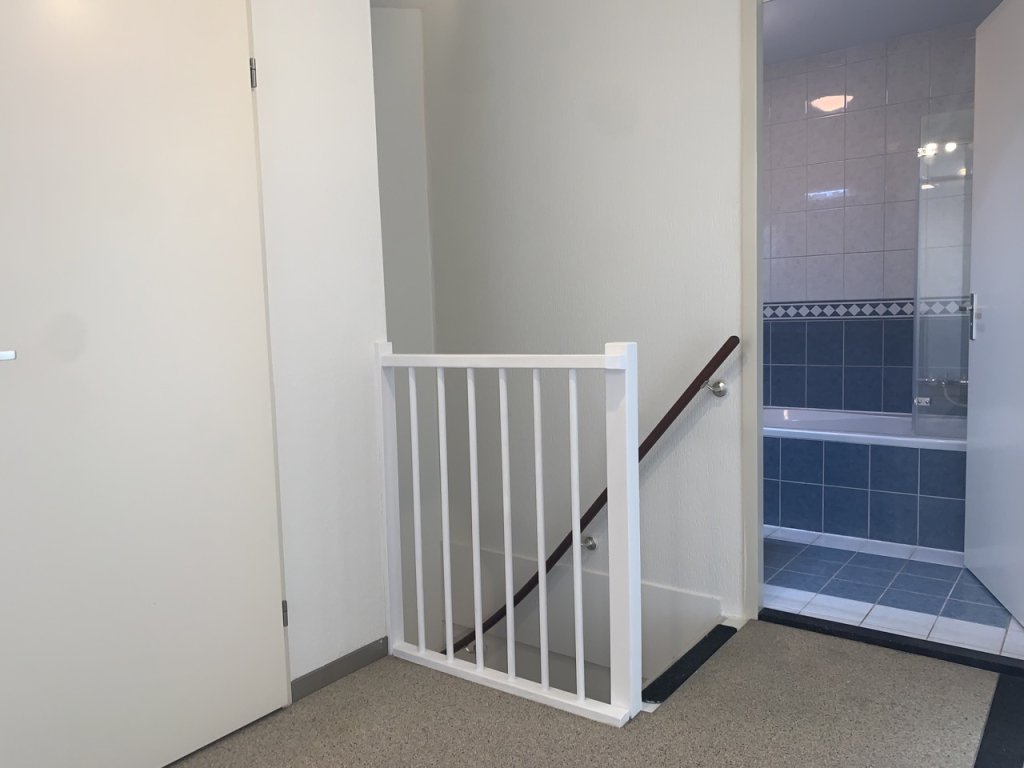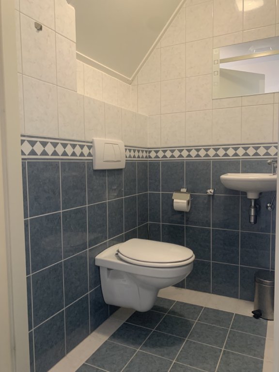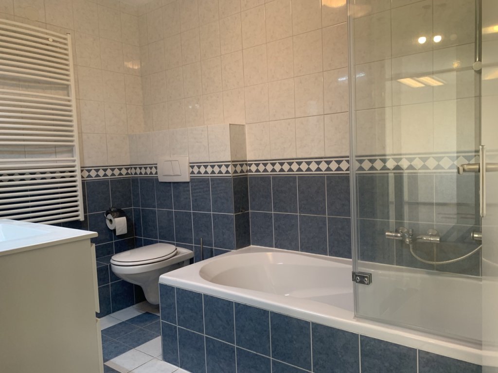 The landing includes a storage space. From here you can access three bedrooms (approx. 14, 6, and 6.5 m²), suitable as the master bedroom, guest/children’s room, and home office. The bathroom is fully tiled and equipped with a new vanity unit, shower with thermostat, luxury wall-mounted radiator, and a floating toilet.