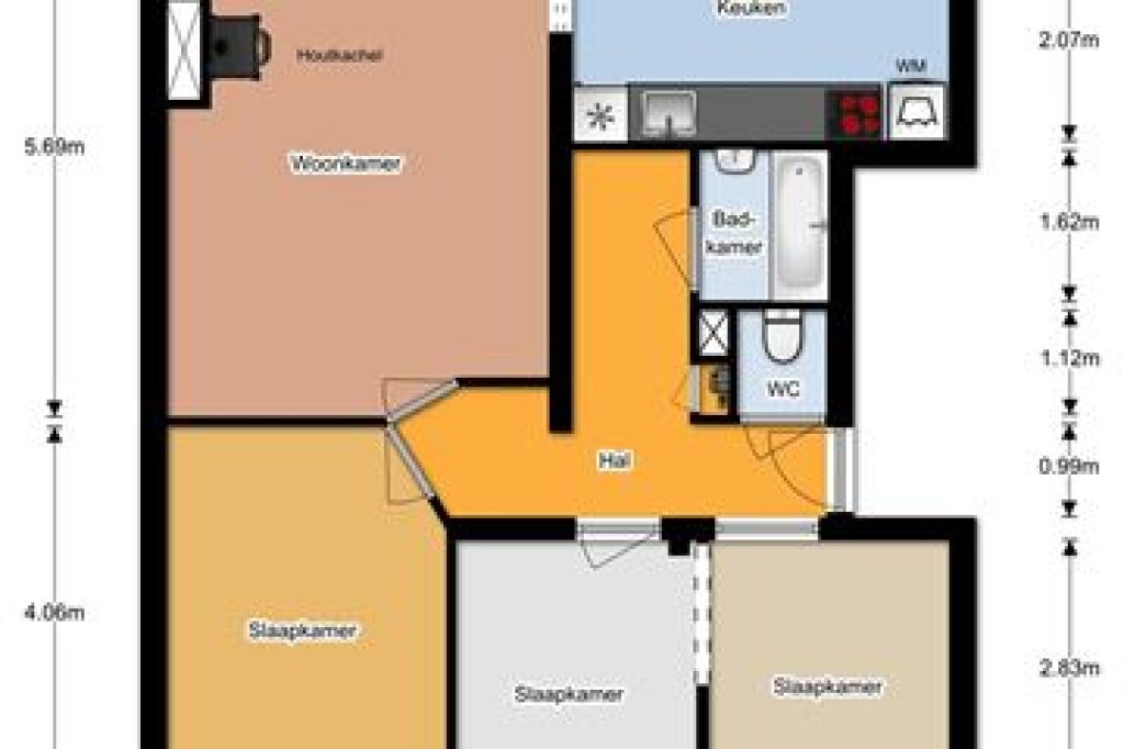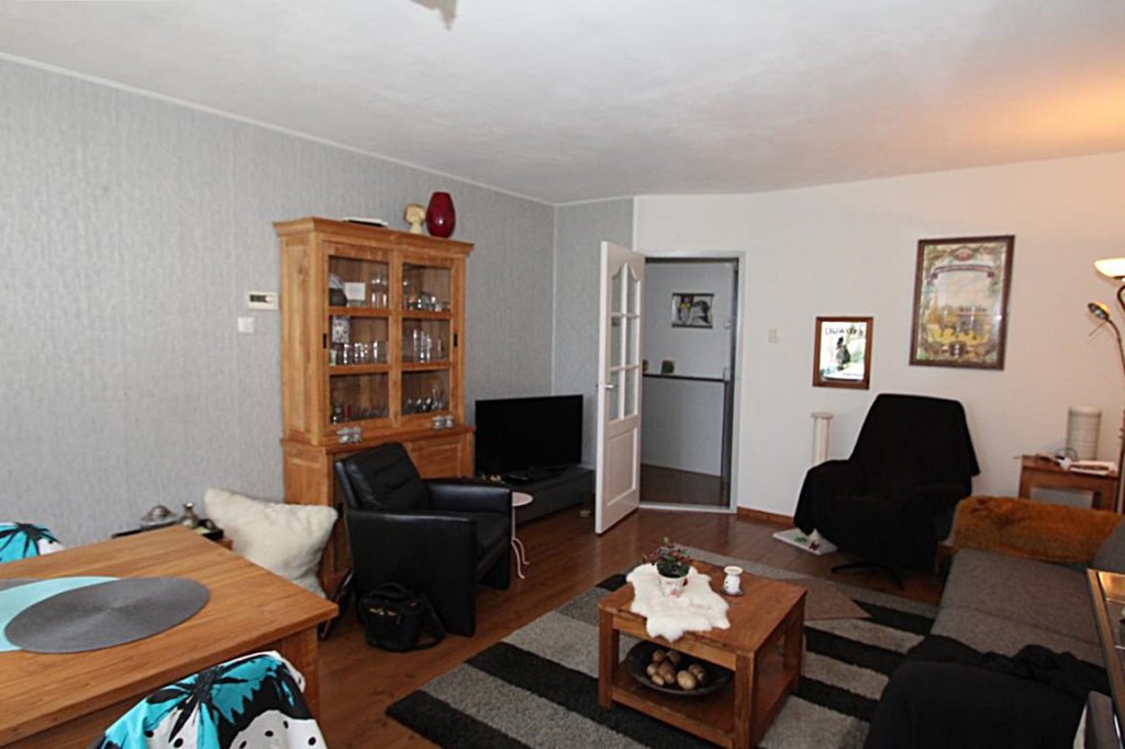 Entrance hall, toilet, meter cupboard, 2/3 bedrooms (2 split bedrooms that can easily be converted into separate bedrooms), small bathroom with bath in shower and sink, cozy living room with warm laminate floor and wood stove, kitchen with neat kitchen with extractor hood and gas cooker, CV