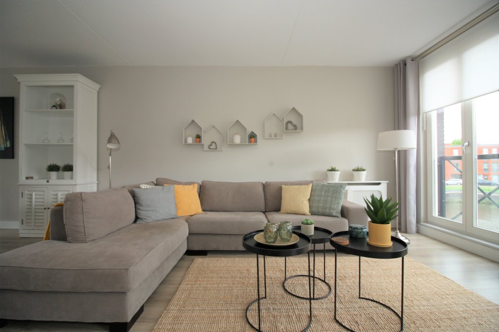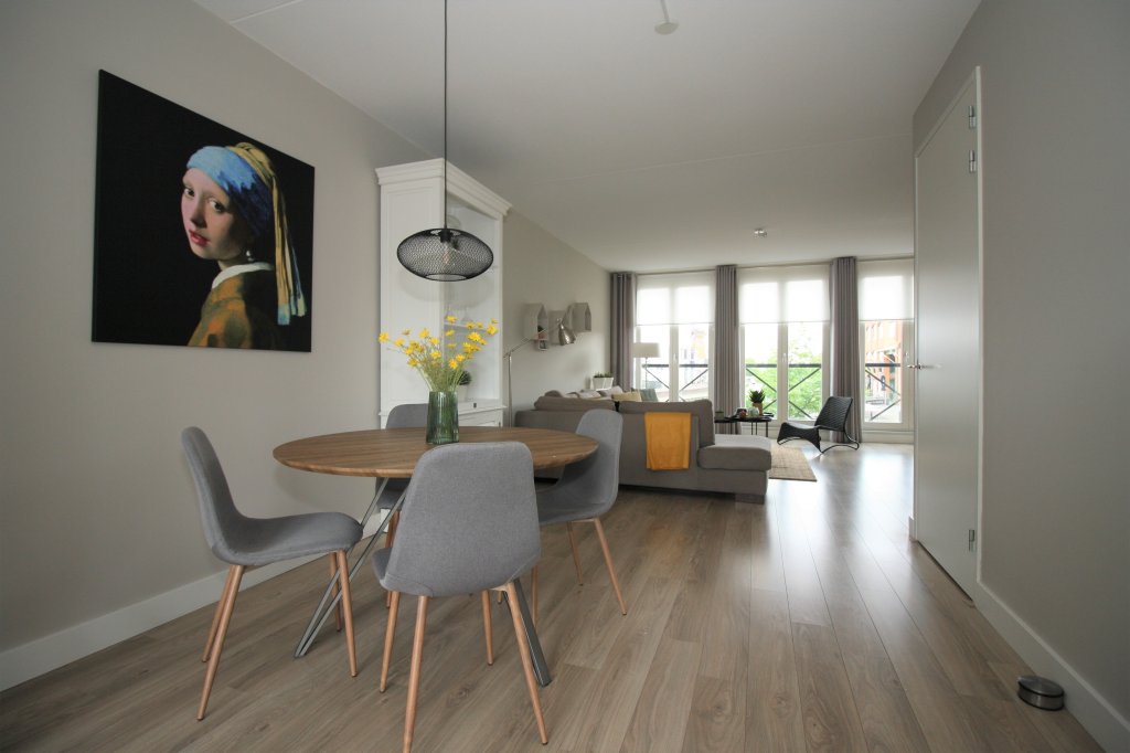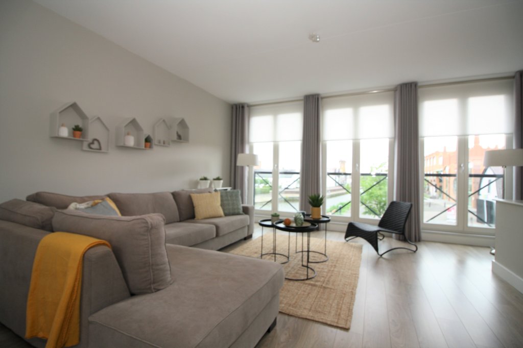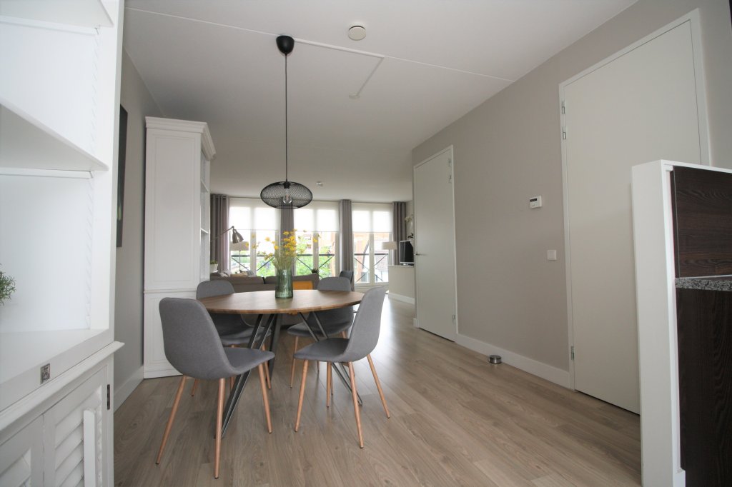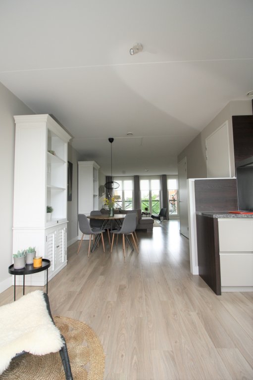 Inner hall with luxury toilet, stairs to the second floor and access to the spacious L-shaped living room. The living room with 3 beautiful double doors at the front has a beautiful view over the harbor and the mill. The living room is in open connection with the kitchen and therefore has an area of 45m2. From the kitchen you have access through patio doors to the spacious roof terrace of 20m2, which is south facing. The terrace has a large awning.