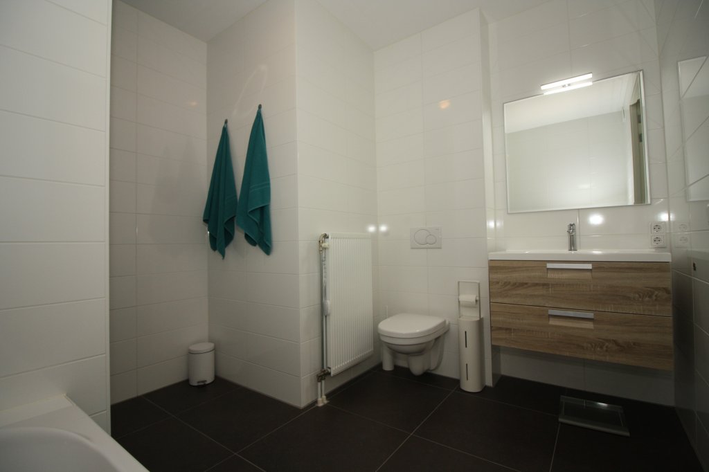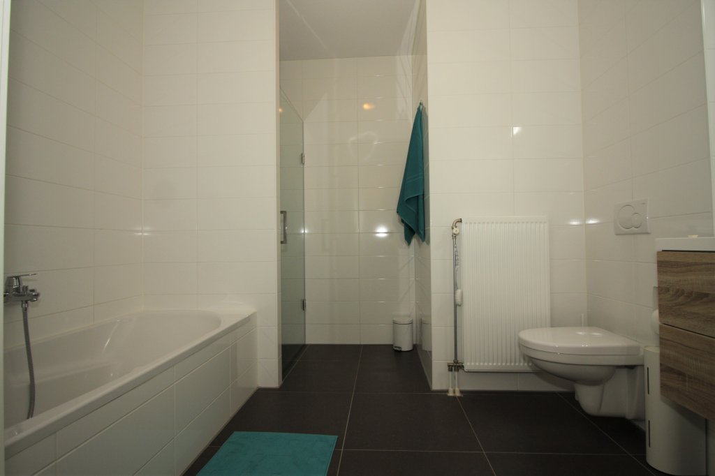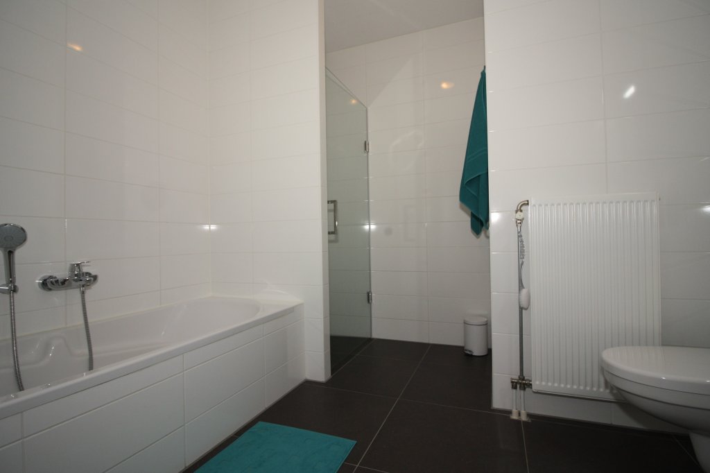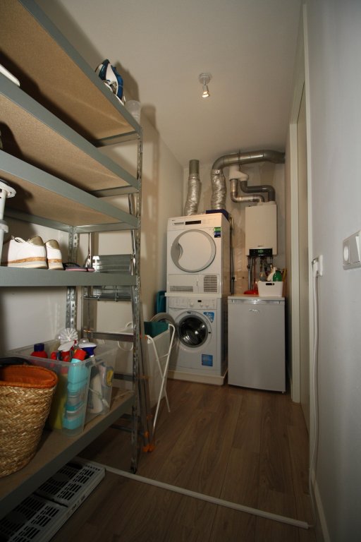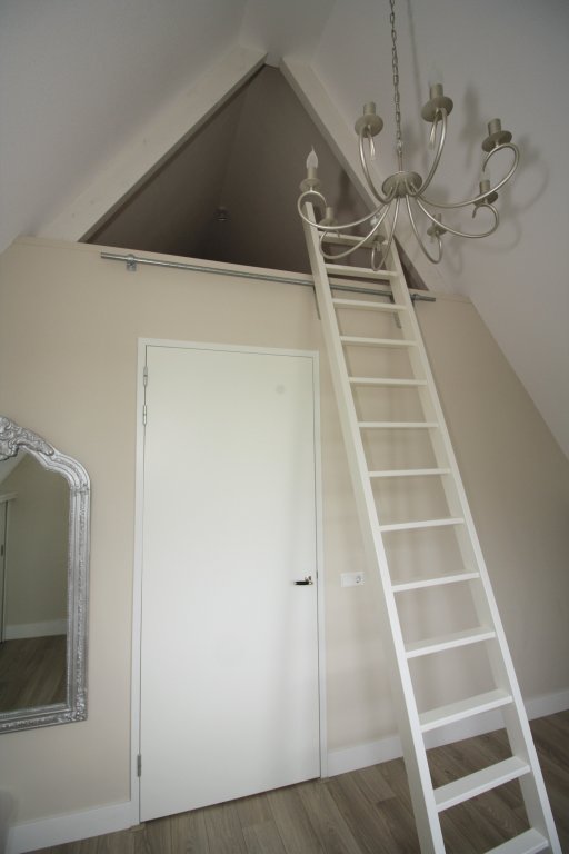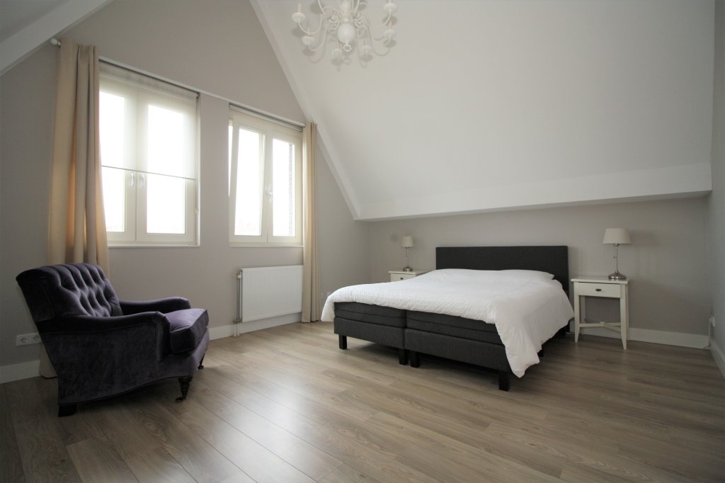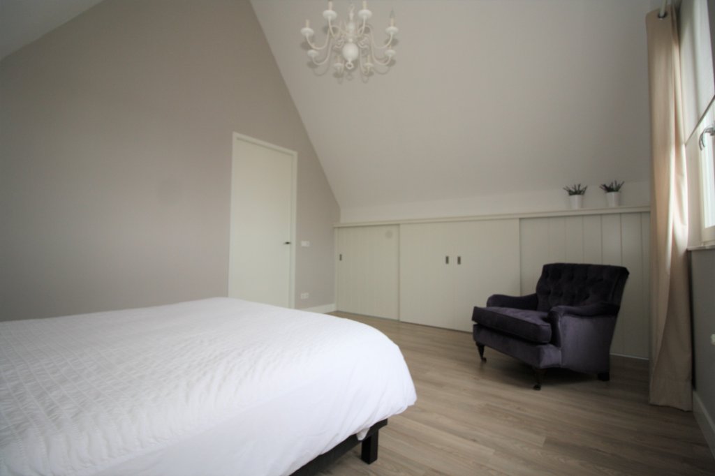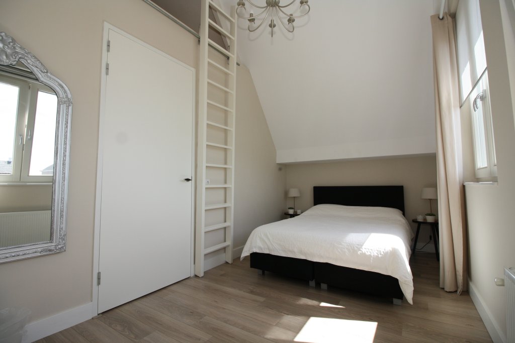 Landing with access to 2 bedrooms, the bathroom and the technical room of approx. 4 m2, with space for the washing machine and dryer. The spacious master bedroom of approx. 21 m2 at the front, has high sloping ceilings. a second bedroom of approx. 14m2 at the rear, also has sloping high ceilings. The fully equipped bathroom has a walk-in shower, a bath, a wall-mounted toilet, washbasin and design radiator. From the small bedroom there is access to a storage room, which can be reached by stairs. The space is suitable for both storage and accommodation for guests. Both bedrooms have cupboard walls incorporated in the slopes and have both laying and hanging areas.