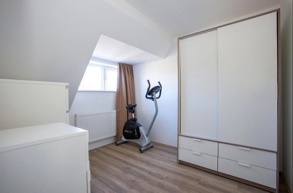The bedrooms and bathroom are located on the upper floor. The master bedroom at the front of the house has built-in closets and a separate air conditioner, so it stays nice and cool even on hot summer days. The second room is versatile: workspace, hobby room, or second bedroom, anything is possible. The modern bathroom features a vanity and a walk-in shower. The separate cabinet for the washer and dryer is also convenient.