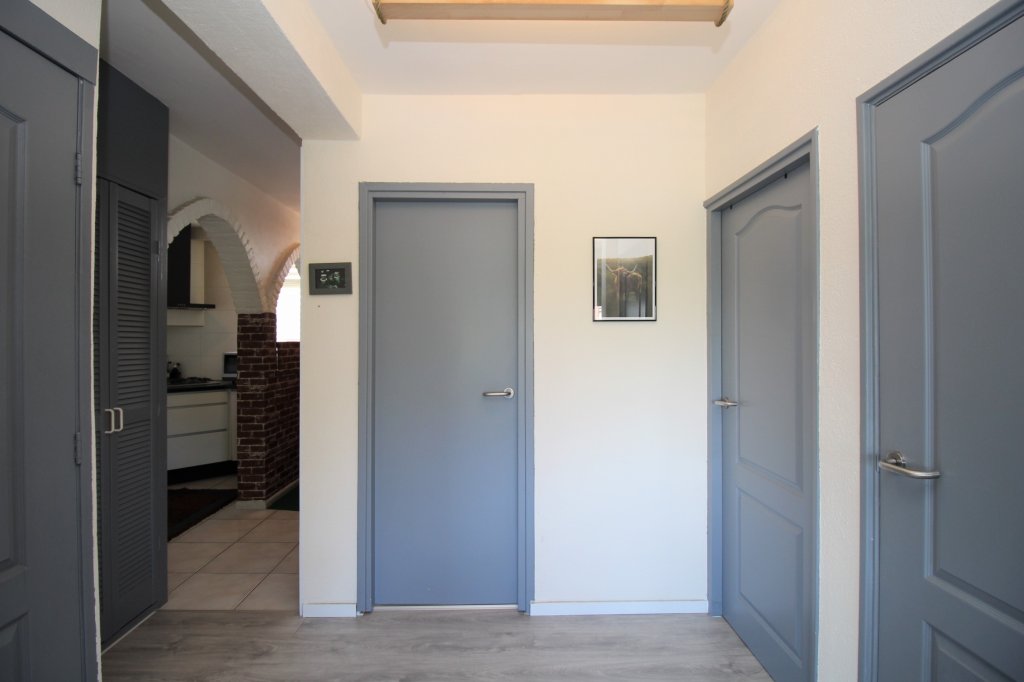 Entrance hall with access to the rooms, kitchen equipped with all amenities (dishwasher, fridge, stove), spacious living room with sitting and dining area and access to the balcony at the front, master bedroom (approx. 10 m2) with a double bed, built-in cupboard, second bedroom (approx. 5.5 m2) in use as a study , bathroom with shower, washbasin and toilet, hallway with storage cupboard. At the back of the gallery, there is also the opportunity to sit outside, so always a place in the sun or shade!