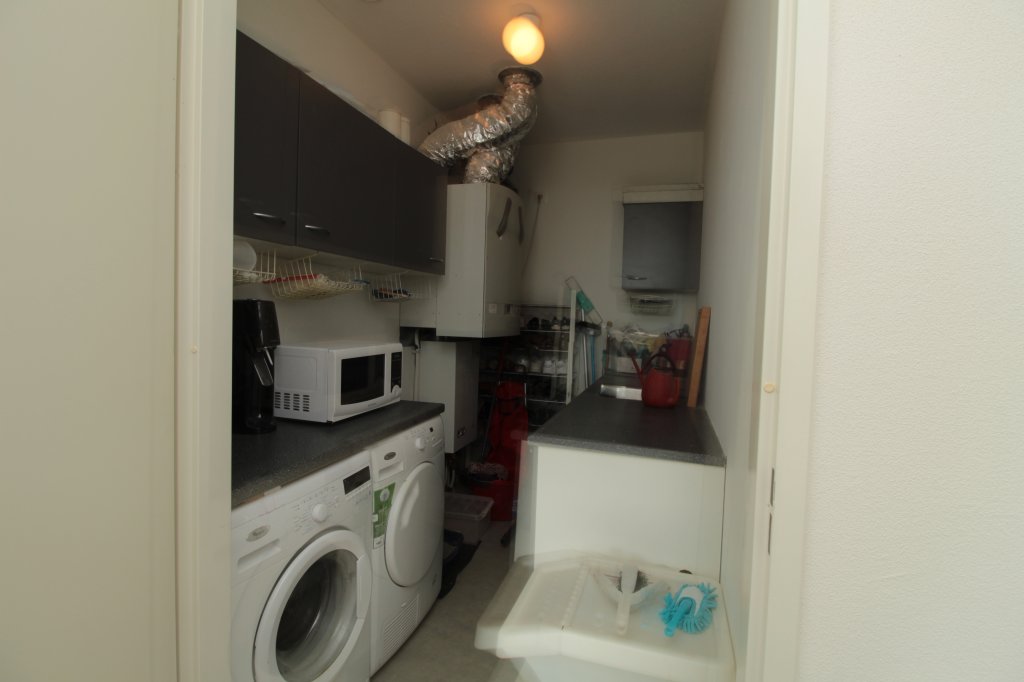 Sixth floor: entrance of the house with hallway to the spacious and bright living room with half open kitchen (with induction hob, fridge oven and dishwasher) and lockable conservatory. From the hall there is access to separate toilet, two spacious bedrooms (one bedroom is furnished as an office), bathroom (with shower, bath and sink), indoor storage room with washer, dryer and magnetro.