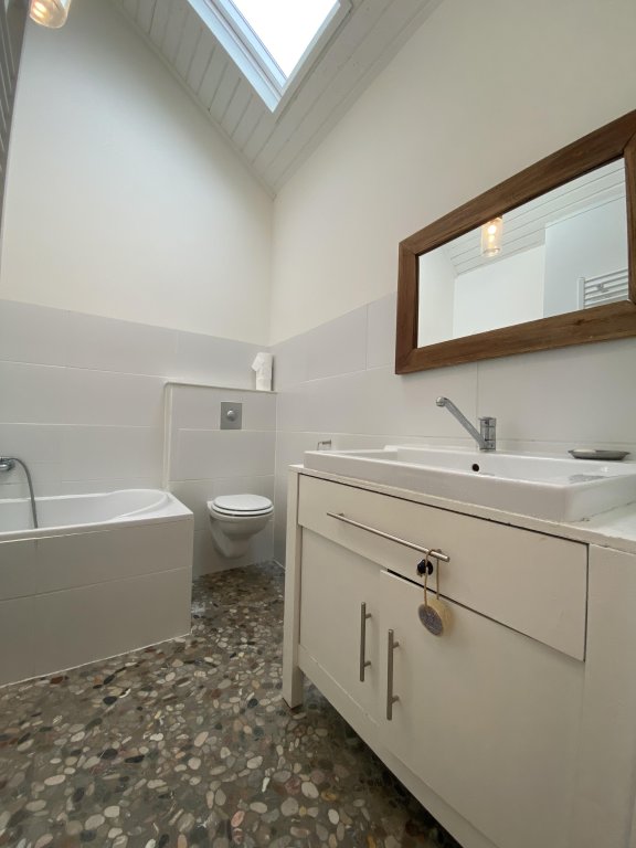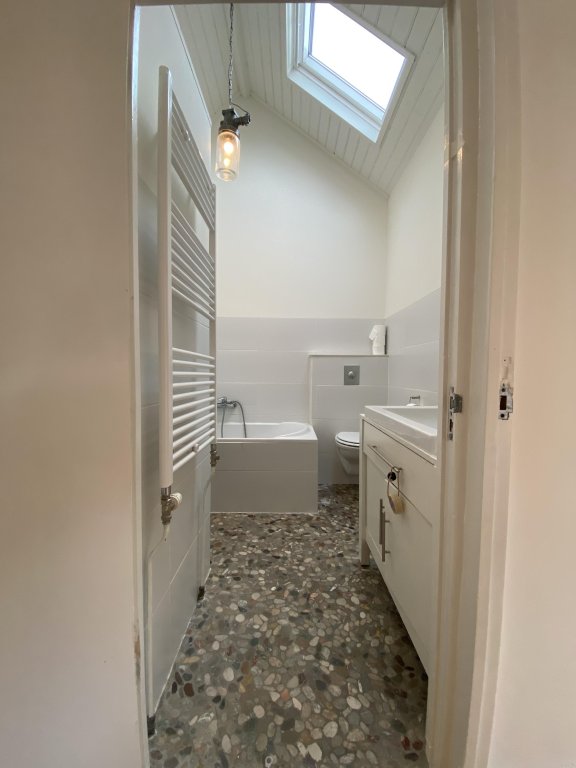On the second floor are the 2 spacious bedrooms, 1 at the rear and 1 at the front. In between is the bathroom which is equipped with a bathtub / shower, washbasin with vanity unit, 2nd toilet and a combi washing machine / dryer. The landing has a small storage loft and there is a separate storage room where the boiler is located.