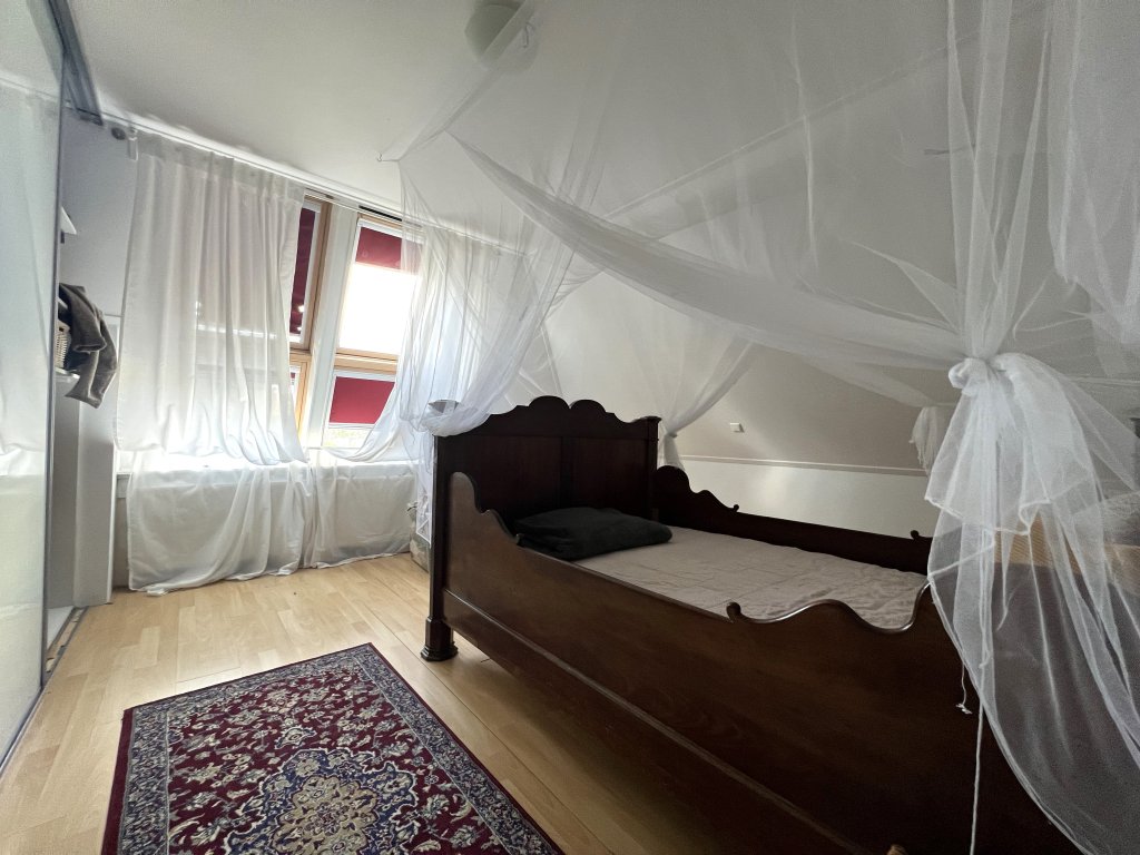 Spacious landing. Light master bedroom with fitted wardrobe and sink. Second bedroom with fitted wardrobe. Third bedroom and fourth small (sleeping) room with skylight. Neat bathroom equipped with shower, bath, washbasin and toilet.