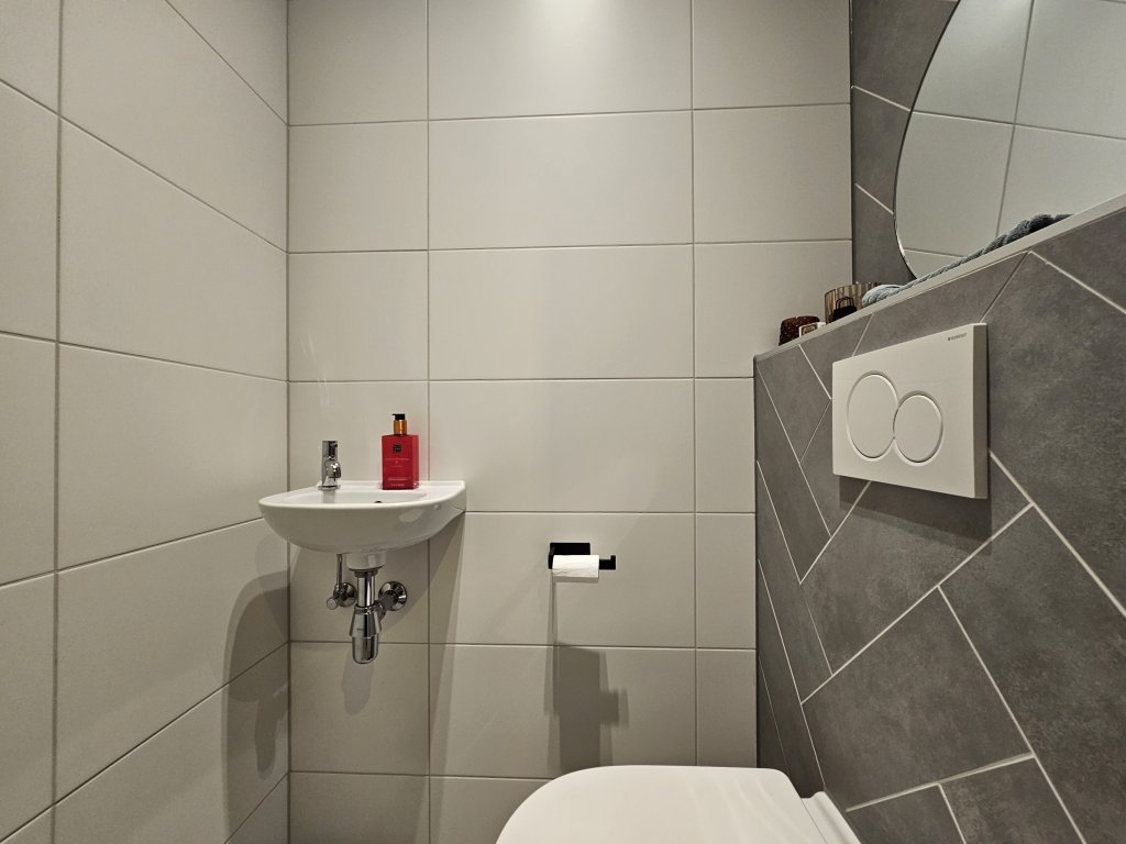 You enter the hall with meter cupboard, wardrobe space, staircase to the first floor and access to a modern toilet with washbasin.