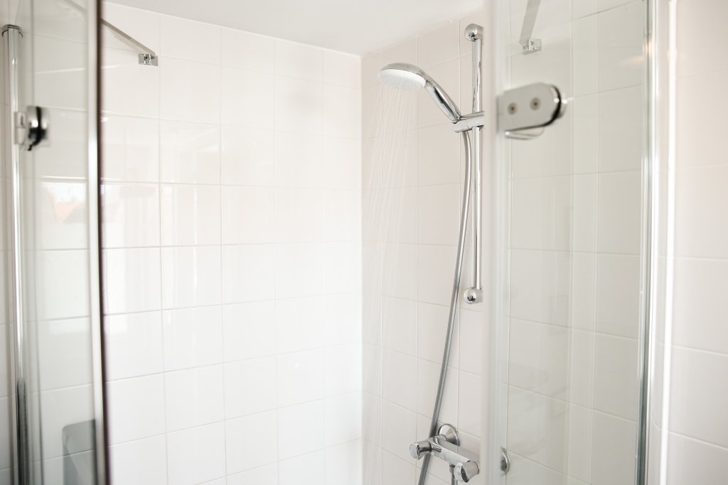 De badkamer is voorzien van een moderne douchecabine en wastafel.