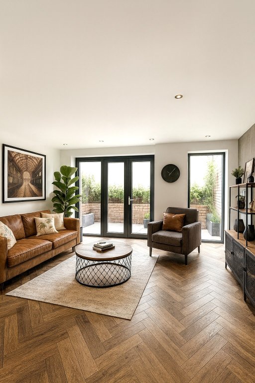 Elegant herringbone PVC flooring with underfloor heating and cooling