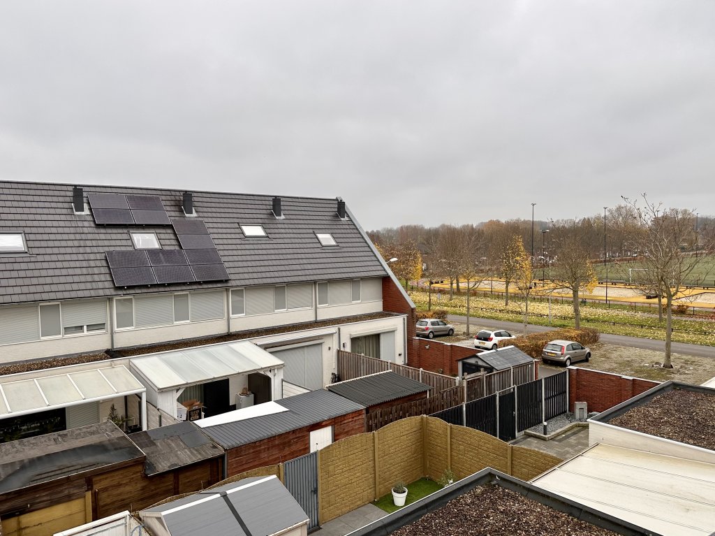 Upon entering the reception hall you have access to the toilet and the living room with open kitchen. The spacious living room with laminate floors and air conditioning and provides access to the garden with a spacious terrace roof. At the front of the house is the spacious kitchen with gas stove, refrigerator, dishwasher and oven. The kitchen also has a stair cupboard with storage space.