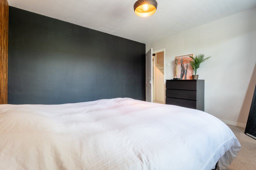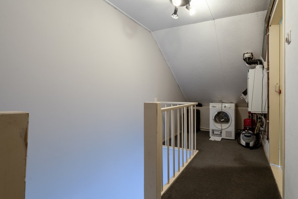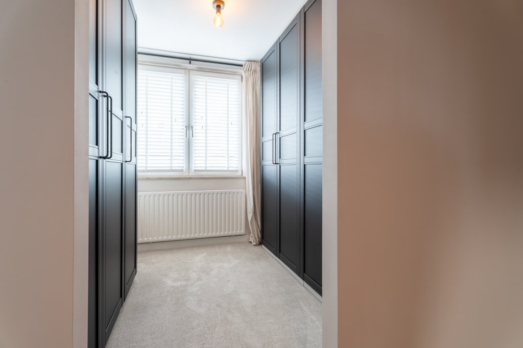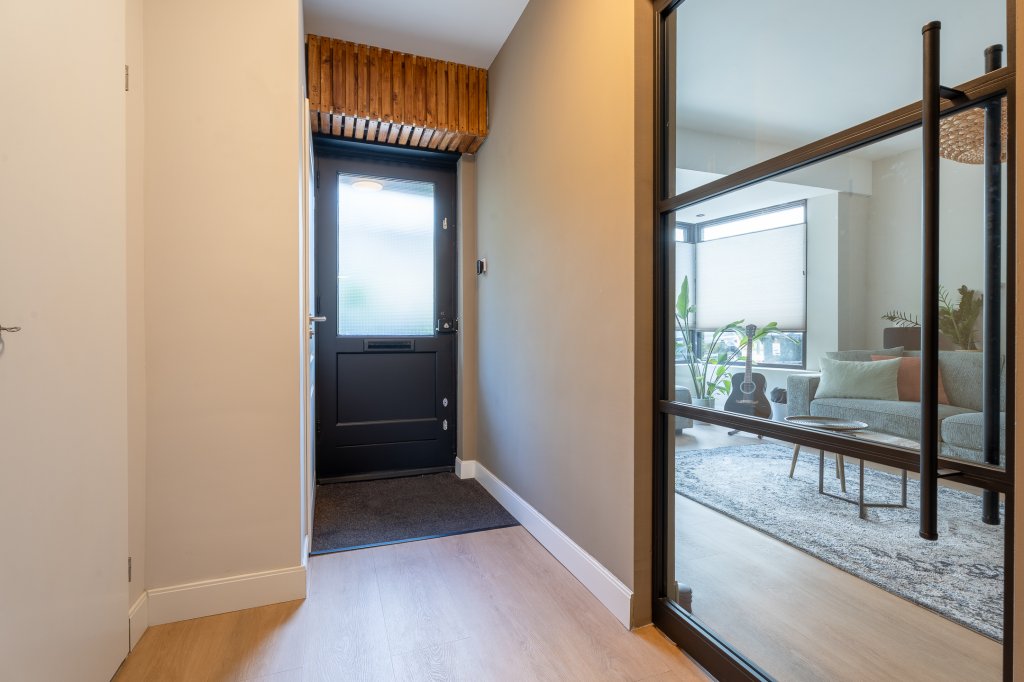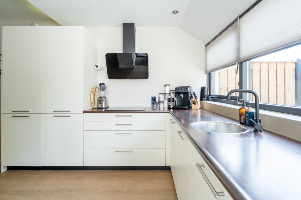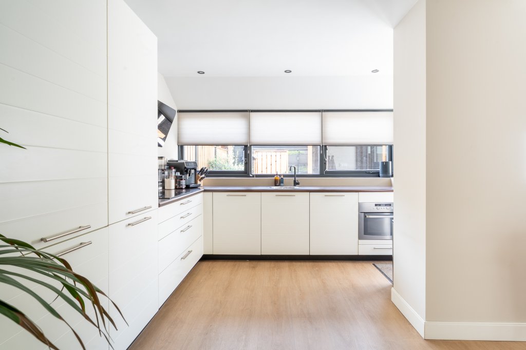 The living room is wonderfully light thanks to the large windows at both the front and rear. An attractive fireplace/stove provides extra warmth and cosiness during cold days. Thanks to the open layout, the living room feels spacious and offers plenty of options for a cosy sitting area. The kitchen, located at the rear of the house, has a practical L-shaped layout with plenty of work and storage space. Thanks to the side window, there is plenty of natural light, creating a pleasant cooking environment. The kitchen is equipped with various built-in appliances and offers direct access to the back garden. In addition, the kitchen has been extended in the past, providing extra space.