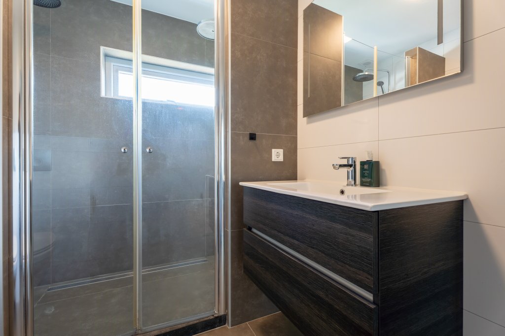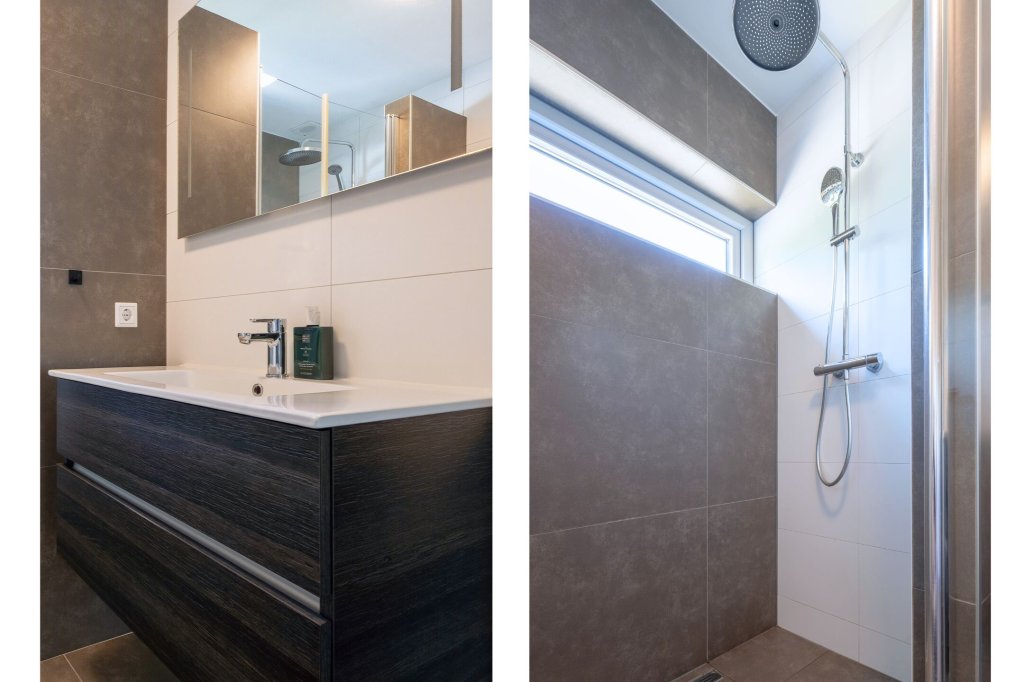 On the first floor, there are two spacious bedrooms and a closet room, all of which have carpeted floors and sleek wall finishes. The bathroom is modern and practical. Here you will find a toilet, a sink and a double shower. The washing machine is also located here. Thanks to natural ventilation, the room remains fresh and well ventilated.