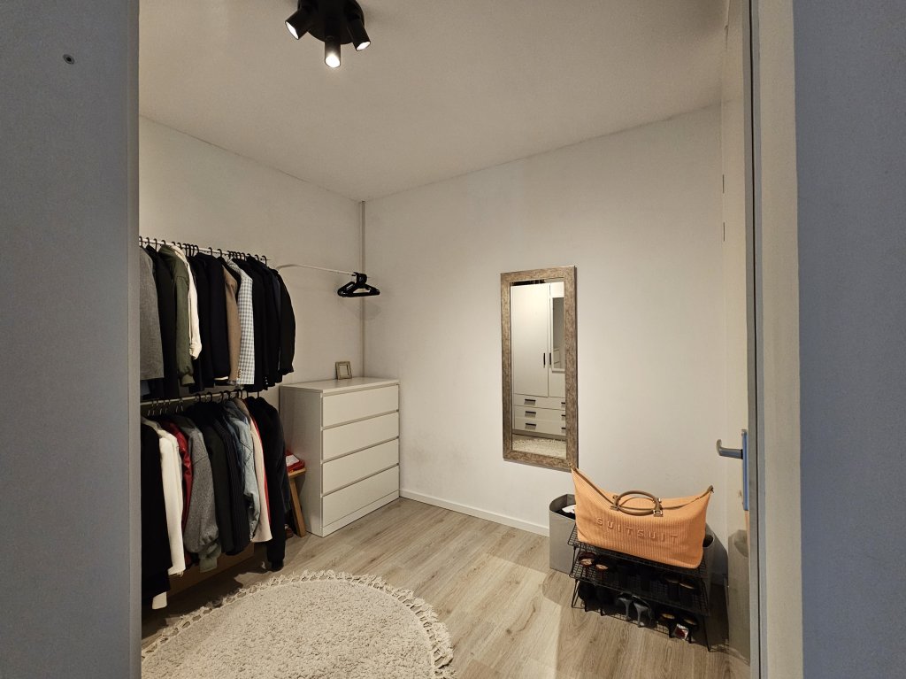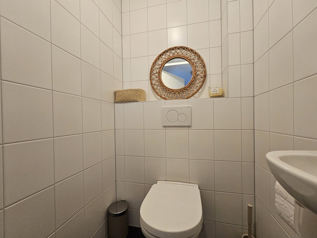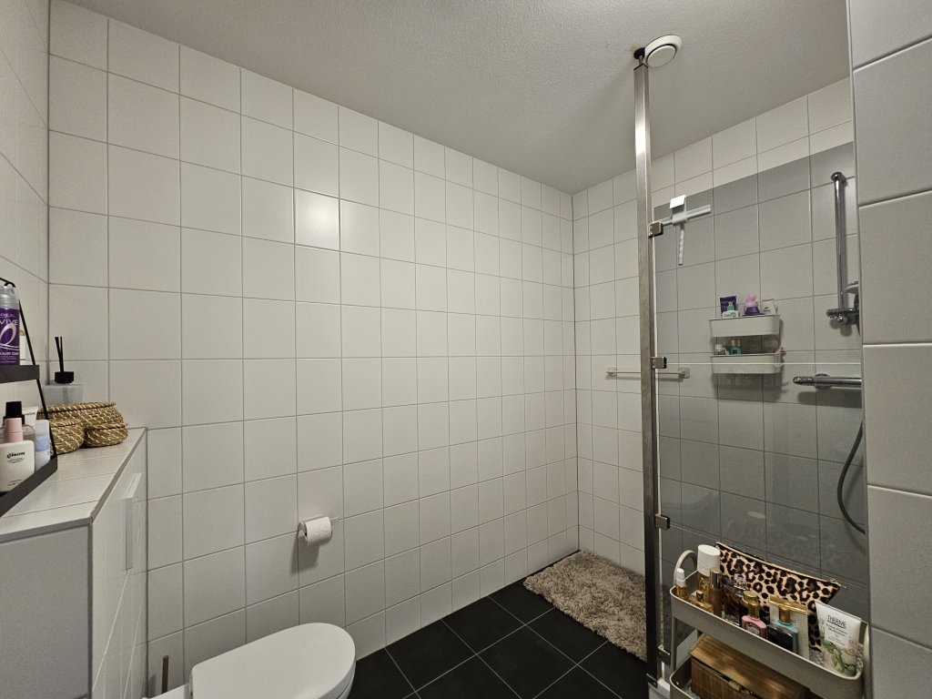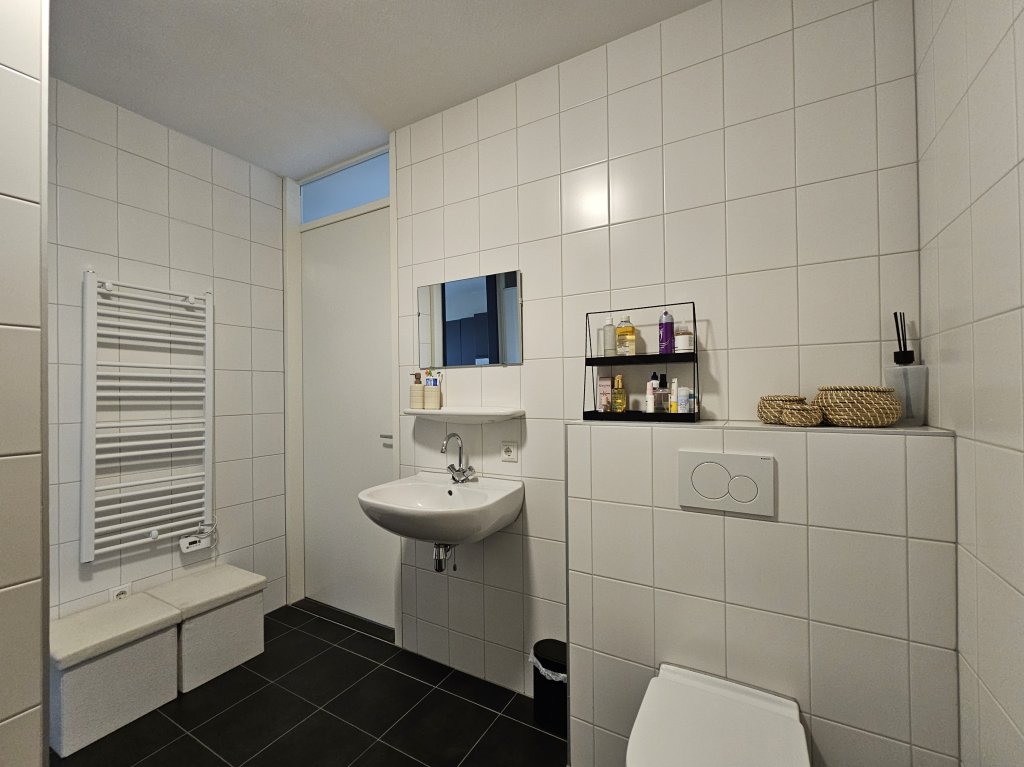 The bathroom is located in the center of the apartment and features a sink, walk-in shower, second toilet, and heated towel rail.