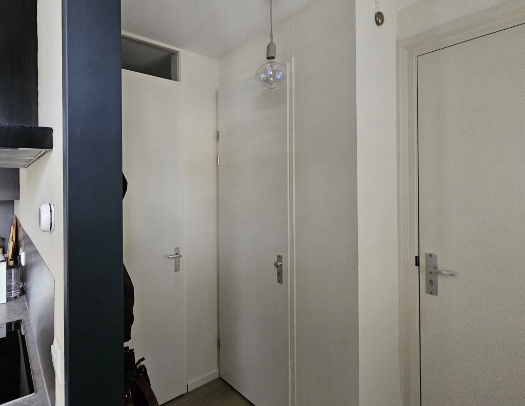 You enter the apartment from the central hall, which provides access to the meter cupboard, toilet, and the living room with an open-plan kitchen.