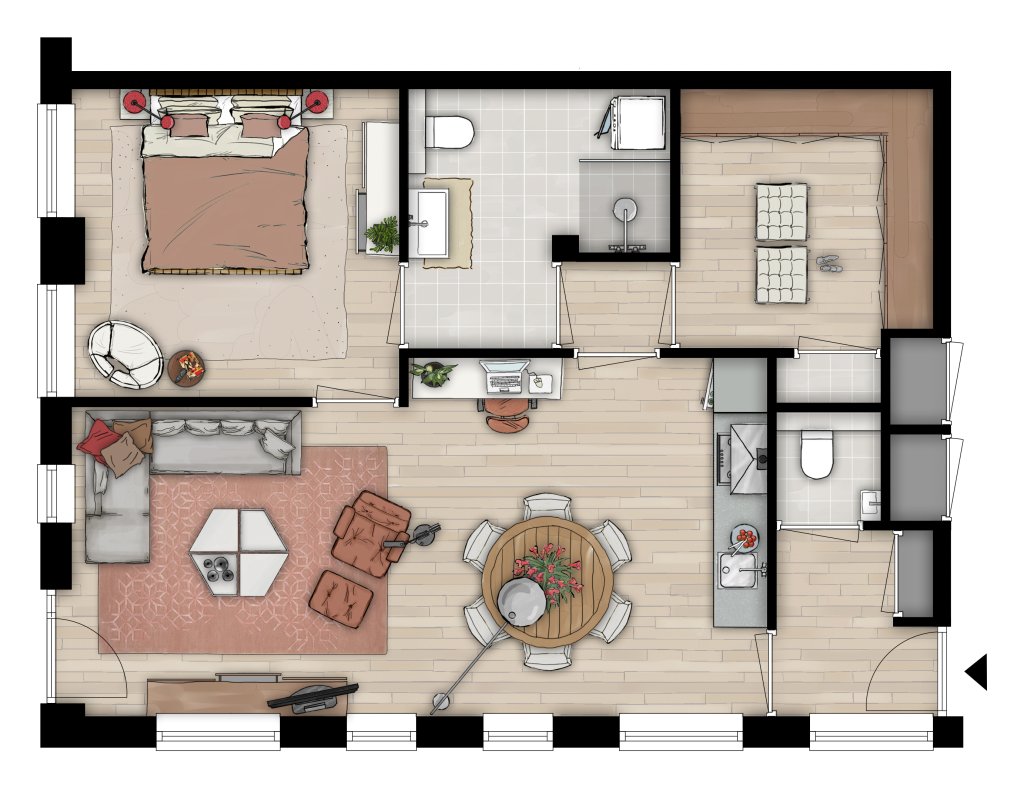 From the living room, you can access the other rooms, such as the bedroom, study, and bathroom.
