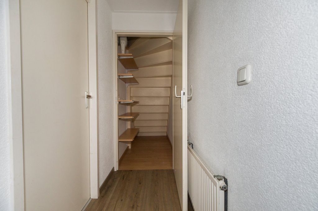 Hall with spacious closet, and access to the spacious living room with open kitchen. The living room has laminate flooring, stairs cupboard and access to the backyard with garage. Modern, white kitchen with plastic worktop and various appliances, including a 4-burner stove, extractor, oven, dishwasher and refrigerator. From the kitchen there is access to the utility room and toilet.