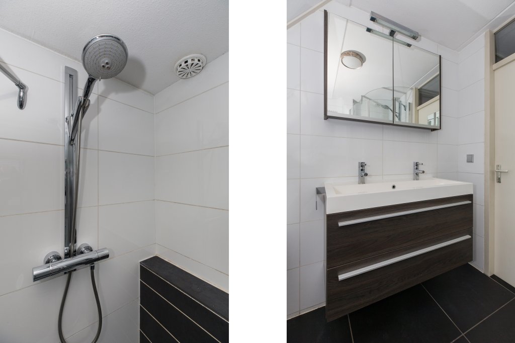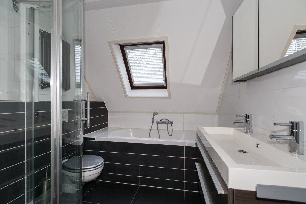 Landing with fixed staircase to the two floor and access to three bedrooms and the bathroom. In the bedrooms there is also a beautiful laminate floor. Luxury bathroom in white/black tones with bath, toilet and double sink.